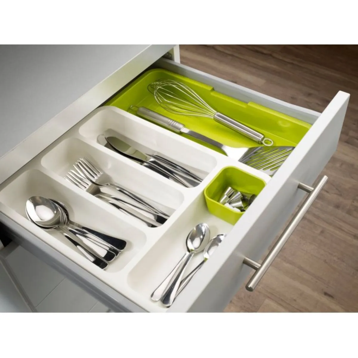 Organizator za kuhinjski pribor sastoji se od prostora za noževe, vilice, žlice, male žlice te se može proširiti da možete staviti i kuhinjska pomagala. Ima i jednu dodatnu malu posudu za sitne predmete. Napravljen je od kvalitetne plastike.