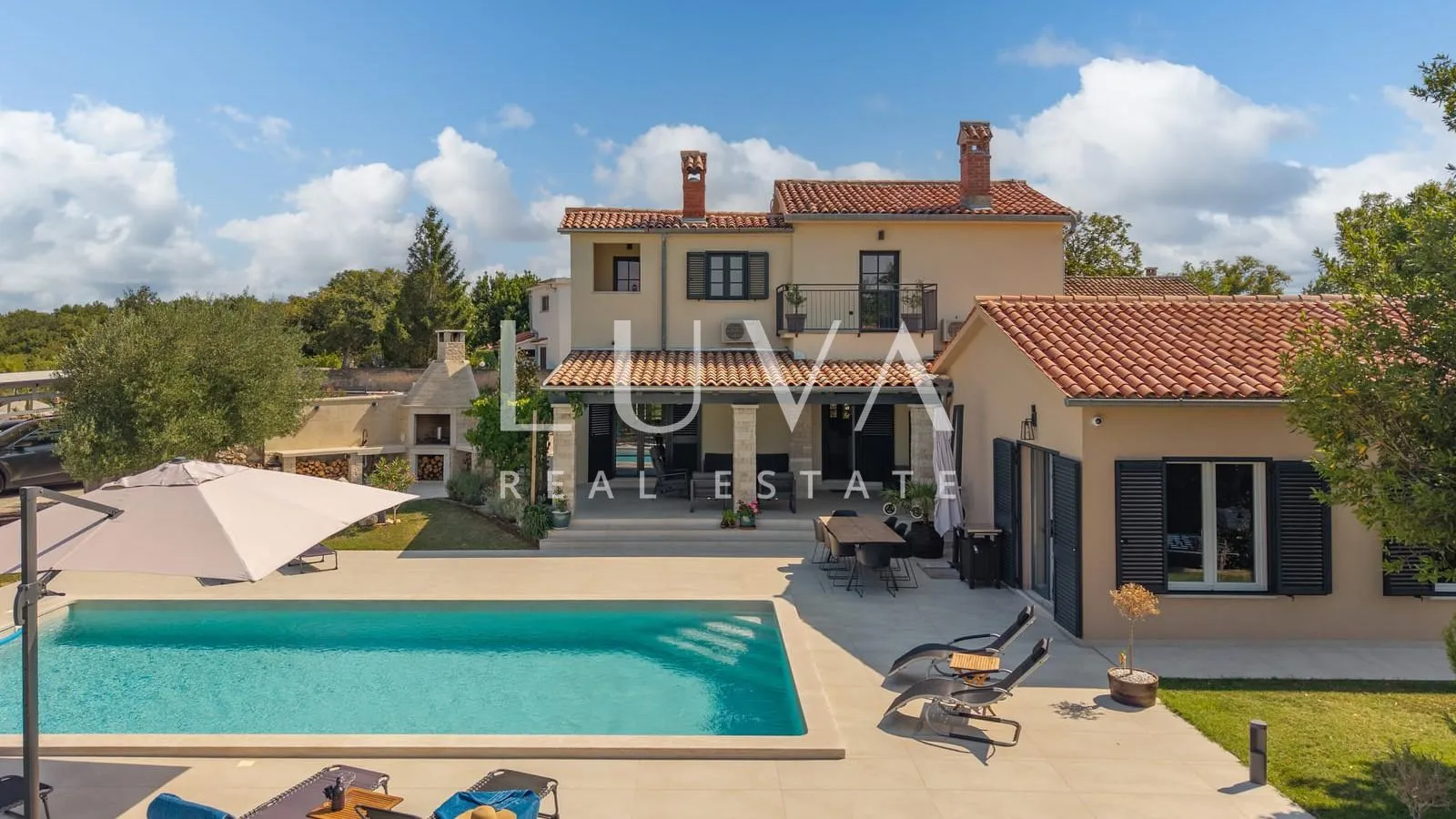 Luksuzna vila s bazenom i velikim posjedom u Istri U mirnom mjestu Kunj, nedaleko od Labina, na prodaju je moderno uređena vila koja spaja luksuz i udobnost s autentičnim istarskim ugođajem. Vila je izgrađena 2023. godine i odlikuje se vrhunskom gradnjom u kombinaciji armiranog betona, kamena i cigle. Prostire se na 304 m² bruto površine (273 m² neto), dok se cijeli posjed prostire na impresivnih 2.459 m², potpuno ograđenih i uređenih za potpuni mir i privatnost. Energetski razred A/A+ jamči visoku učinkovitost i niske troškove održavanja. Prostran interijer i vrhunski sadržaji Unutarnji prostor vile osmišljen je s naglaskom na udobnost i funkcionalnost. Sastoji se od moderne kuhinje, prostranog dnevnog boravka, bara i blagovaonice, četiri elegantne spavaće sobe, svaka sa svojom kupaonicom, dodatnog WC-a, te dva hodnika koji povezuju prostor. Na katu se nalaze dvije natkrivene lođe i velika terasa s pogledom na zelenilo, idealna za opuštanje. Vila je opremljena suvremenim sustavom grijanja i hlađenja: šest Mitsubishi klima uređaja, toplinska pumpa AQUARK, kamin domaće proizvodnje Termotehnika te tri Ariston električna bojlera. Privatni vanjski raj Eksterijer ove nekretnine osmišljen je kao savršeno mjesto za odmor i druženje. Prostrani vrtovi površine 1.000 m² brižno su uređeni, a dodatno oplemenjeni dječjim igralištem i vrtnom kućicom za pohranu. Grijani bazen veličine 50 m² s velikim sunčalištem od 150 m² pruža potpun užitak u svim sezonama. Uz bazen se nalazi natkrivena terasa od 30 m², dok vanjska kuhinja s roštiljem od kanfanarskog kamena poziva na istinske mediteranske užitke. Vila ima pet privatnih parkirnih mjesta, od čega su dva natkrivena. Ako je za ovu nekretninu na nekoj drugoj web stranici objavljena niža cijena ista vrijedi i kod nas. U slučaju posla posredovanja naše agencije postoji obveza plaćanja agencijske provizije. Za sva dodatna pitanja i razgled nekretnine stojimo Vam na raspolaganju Za ovu nekretninu je kontakt: Ivan, +385 91 288 0082 ID KOD AGENCIJE: 15539 Ivan Jelaska Mob: +385 91 288 0082 E-mail: ivan@luvarealestates.com www.luvarealestates.com