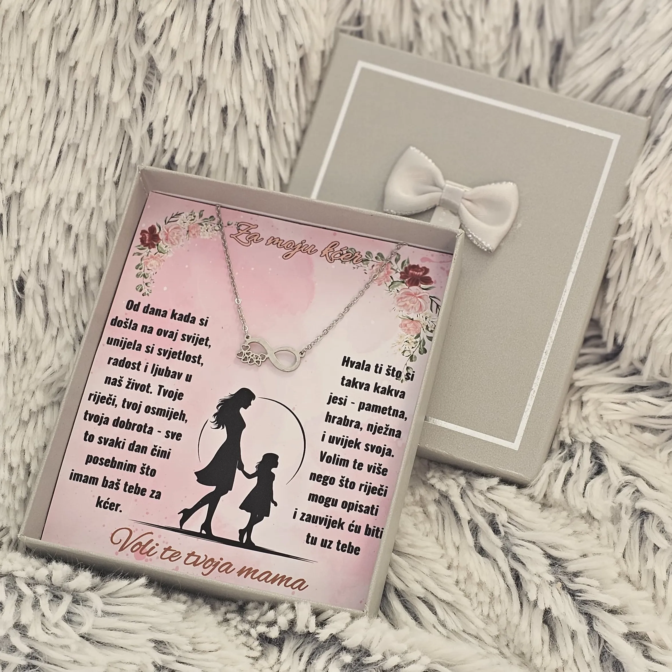 Ovaj elegantni lančić s privjeskom beskonačnosti i cvjetićem dolazi u prekrasnoj poklon kutiji s posebnom porukom od mame za kćer.