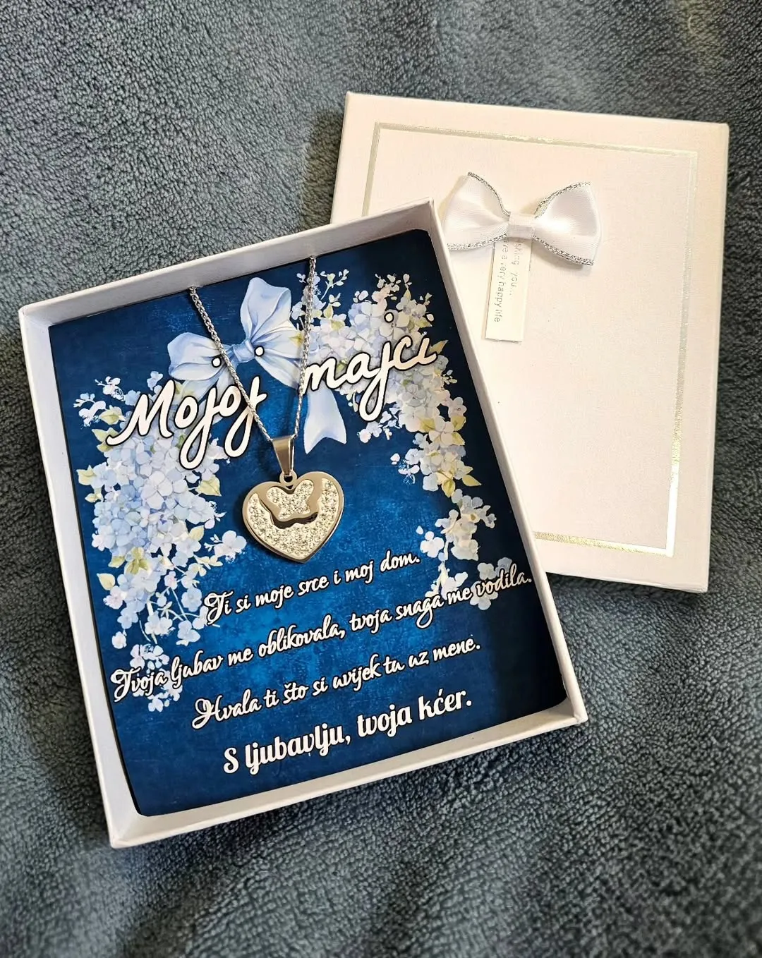 Ovaj prekrasni lančić s privjeskom u obliku srca dolazi u luksuznoj poklon kutiji s emotivnom porukom od kćeri majci – savršen način da zahvalite za svu ljubav, brigu i snagu koju vam je pružila.