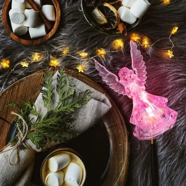 Ovaj prekrasni LED anđeo visine oko 10 cm donosi čaroliju u vaš prostor. Njegovo svjetlo se nježno prelijeva kroz 7 različitih boja, stvarajući mirnu i opuštajuću atmosferu, savršenu za ukrašavanje doma ili kao dar voljenoj osobi. Zahvaljujući baterijskom napajanju, možete ga smjestiti bilo gdje bez potrebe za utičnicom, a dolazi već pakiran u kutiji – spreman za poklon.