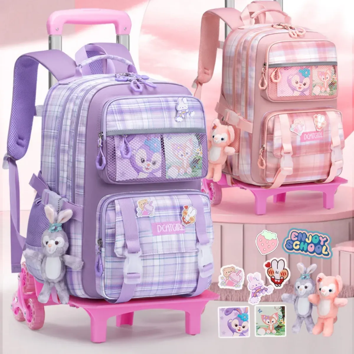 Elegantna i praktična školska torba s kotačićima dostupna je u dvije boje – roza i ljubičasta. Dizajnirana posebno za učenike od 1. do 6. razreda, ova torba nudi dovoljno prostora za knjige, bilježnice i školski pribor. Zahvaljujući šestokotačnom sustavu, dijete torbu može lako vući čak i po stepenicama. Izrađena od kvalitetnog i izdržljivog materijala, torba osigurava dugotrajnu upotrebu, dok atraktivan dizajn i priložena plišana maskota čine školu zabavnijom.