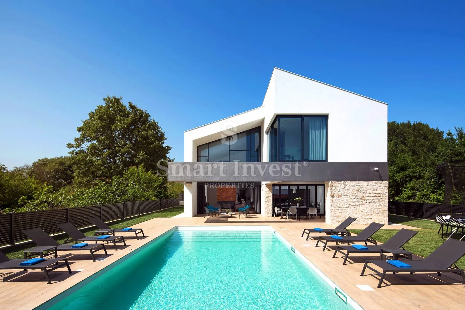 LIŽNJAN, Ekskluzivna vila minimalističkog dizajna i luksuznog interijera, na odličnoj mirnoj lokaciji svega 2 km udaljenoj od mora, plaža i centra Medulina. RASPORED Vila stambene površine 444 m2 smještena je na lijepo uređenom zemljištu površine 910 m2, ima 4 spavaće sobe, 4 kupaonice + 2 pomoćna wc-a. U prizemlju se nalazi raskošni dnevni boravak s dvoetažnom visinom i velikim staklenim stijenama, kuhinja i blagovaona sa izlazom na natkrivenu terasu s ljetnom kuhinjom, prostrana spavaća soba s vlastitom kupaonicom, pomoćni wc. Cijelo prizemlje puno je prirodnog svjetla zbog velikih prozora i stijena, a otvaranjem istih se može lijepo stopiti interijer s eksterijerom za još veću površinu tijekom ljetnih dana. Na katu se nalazi lijepa galerija za opuštanje te tri spavaće sobe, svaka sa vlastitom kupaonicom. Kao i prizemlje, kat je pun svjetla zbog velikih staklenih površina. U podrumskom dijelu se nalazi strojarnica, prostor za zabavu sa sobnim biciklom, stolom za stolni tenis i sl, wc. OPREMA Villa je dizajnirana s pažnjom na detalje, čitav interijer opremljen je visoko kvalitetnim namještajem po narudžbi dostavljenim iz Italije (marke Novamobili, Tomasella, Corazzin), iz opreme možemo istaknuti također: • podno grijanje u svim prostorijama i klime za hladjenje (dizalica topline) • solarni sustav za pripremu tople vode • alarmni sustav i sustav video nadzora • sanitarije Catalano, kupaonski namještaj Modulnova, slavine Fantini • keramika Ariostea • vrtni namještaj Varaschin • kompletan prilaz kući prilagođen je i osobama s poteškoćama u kretanju. Prostrana okućnica vile je opremljena sustavom automatskog navodnjavanja, te kompletno ograđena što jamči vlasnicima i gostima vile potpuni mir i privatnost. Ovdje se nalazi grijani bazen sa slanom vodom (površina 50 m2, grijanje na zasebnu dizalicu topline) te automatskim pokrivačem, terasa za sunčanje s vanjskim tušem, 4 parkirna mjesta sa punjaćem za električna vozila. LOKACIJA Vila je smještena na vrlo lijepoj mirnoj lokaciji, u blizini je nekoliko restorana, trgovina, škola, vrtić i ostali potrebni sadržaji. Udaljenost od mora i plaža – 2 km, centar Pule – 9 km, zračna luka Pula – 13 km. Za više informacija i razgled nazovite +385/91/320-0021 ID KOD AGENCIJE: 13207 Agencija Opatija Ovlašteni posrednik Mob: +385/99/320-0008 E-mail: office@smart-invest.hr www.smart-invest.hr