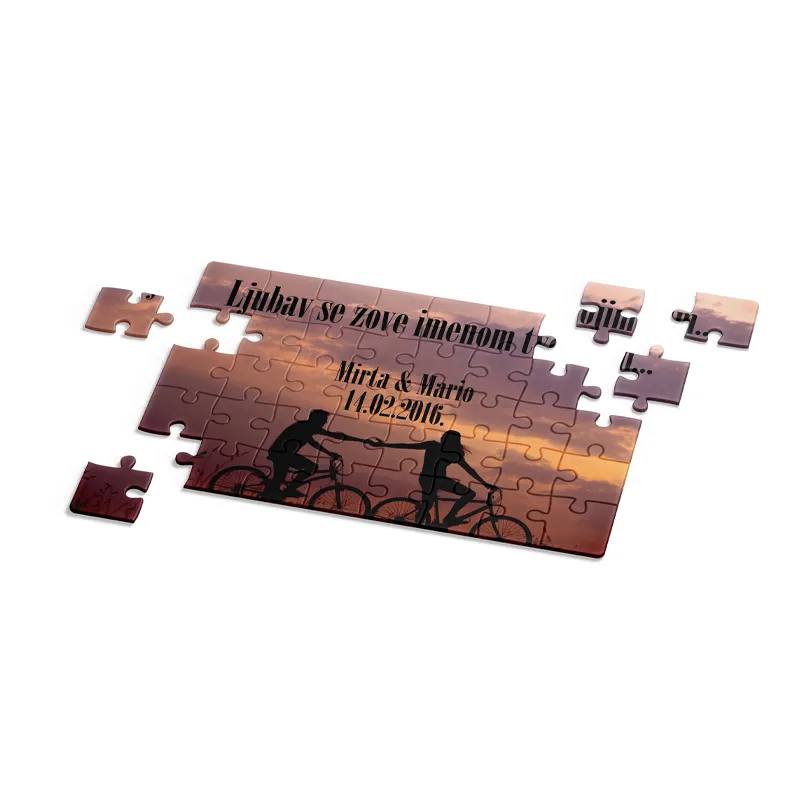 Personalizirane puzzle sa slikom po izboru i imenima Vas i Vašeg partnera, savršen su poklon za osobu koja je u duši još uvijek dijete. Vašu sliku izrađujemo u 120 komada, a mali dijelovi čine veliku sliku koja govori više od tisuću riječi. Boja i položaj teksta ovise o Vašoj fotografiji.