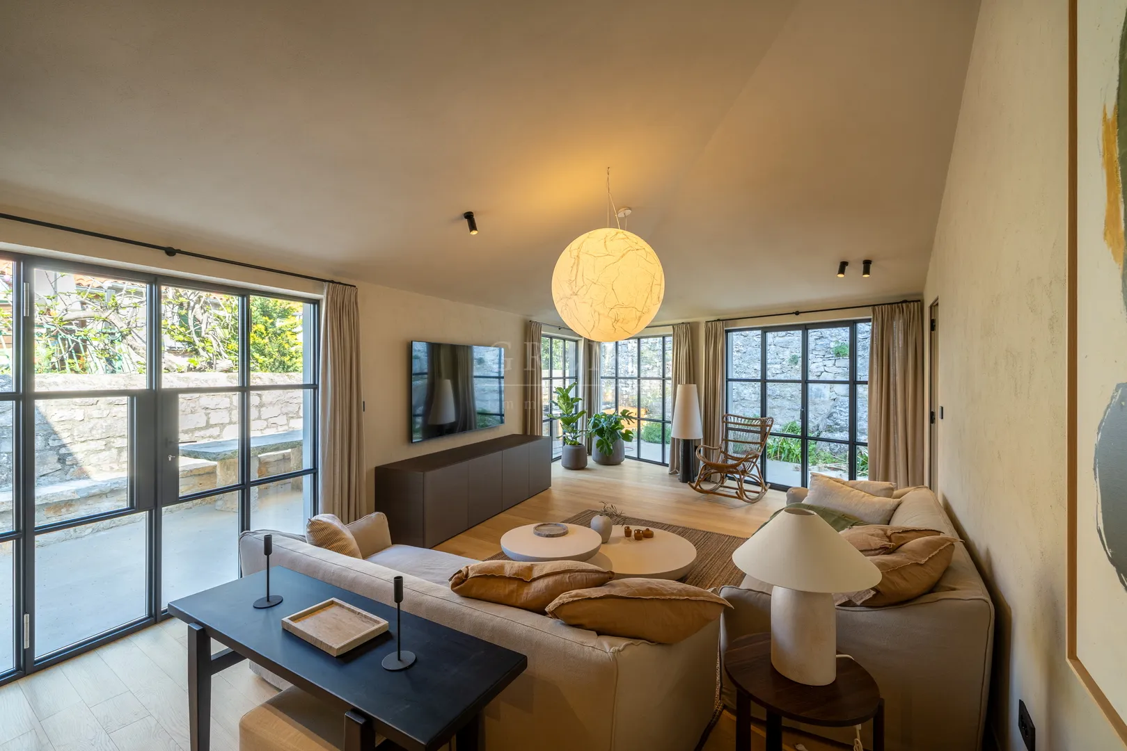 Dnevni boravak: Prostran i svijetao, s pažljivo odabranim namještajem i dekorom. Prirodno svjetlo kroz velike prozore naglašava toplinu drvenih podova i kamene elemente, stvarajući ugodan prostor za opuštanje.