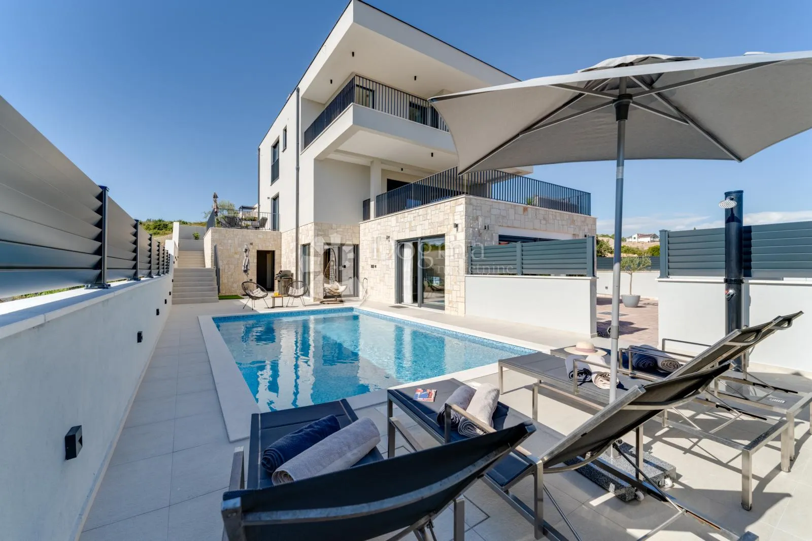 U mirnom dijelu predgrađa Šibenika dostupna je za dugoročni najam moderna i potpuno opremljena vila idealna za obitelj ili poslovne ljude koji traže komfor, privatnost i visoki standard stanovanja. Vila se prostire na 320 m² stambene površine s dodatnih 310 m² uređenog vanjskog prostora. Sastoji se od 4 prostrane spavaće sobe, svaka s vlastitom kupaonicom, te može udobno smjestiti do 8 osoba. U prizemlju se nalazi potpuno opremljena kuhinja s kuhinjskim otokom i kaminom na drva, blagovaonica s pogledom na bazen te dodatna kupaonica. Poseban dio kuće je „fun room“ – prostor za opuštanje i zabavu s velikom garniturom, TV-om, surround sustavom, PlayStationom, stolnim nogometom i stolnim tenisom. Na katu se nalazi prostrani open-space dnevni boravak s kuhinjom i blagovaonicom te izlaz na terasu od 30 m² s prekrasnim pogledom na more. Vila također ima praonicu rublja (perilica i sušilica). Vanjski prostor osmišljen je za maksimalan komfor: grijani bazen (25 m²), sunčalište, lounge zona, plinski roštilj, vanjski tuš te privatno parkiralište za 4 automobila. Lokacija je izuzetno praktična – svega nekoliko minuta vožnje do centra Šibenika, u blizini trgovina, restorana i plaže. Vila se iznajmljuje dugoročno. Za više informacija i dogovor oko razgledavanja slobodno se javite. Iva Sabljić Martinović 0991919761 ID KOD AGENCIJE: DA100066977 Iva Sabljić Martinović Asistent u posredovanju Mob: 099/191-9761 Tel: 022/646-360, 022/646-361 E-mail: iva.sabljic@dogma-nekretnine.com www.dogma-dalmacija.com