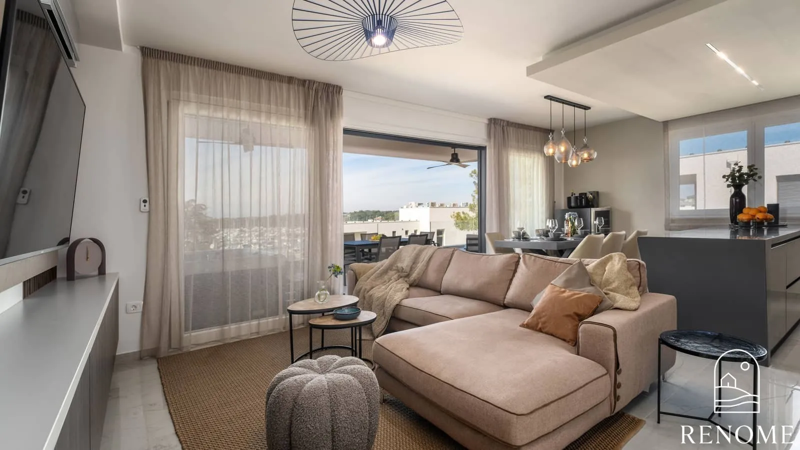 Prostrani open space dnevni prostor uključuje elegantni dnevni boravak s velikim pametnim televizorom, modernu kuhinju s otokom i potpuno opremljenu blagovaonicu.