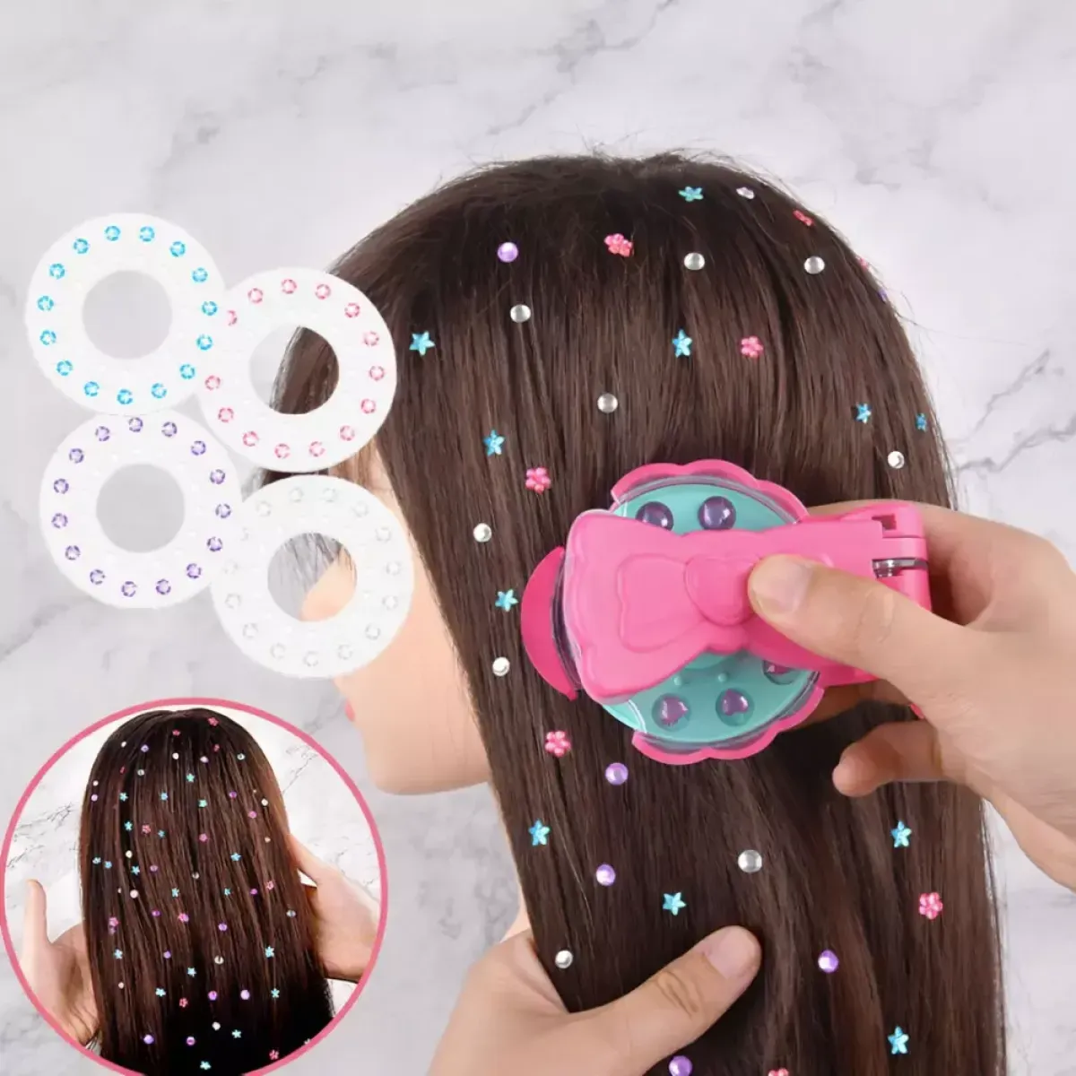 Zabavan i kreativan set koji djevojčicama omogućuje jednostavno ukrašavanje kose šarenim cirkonima i naljepnicama. Magična bušilica lagano i sigurno postavlja ukrase u kosu bez boli, čineći svaku frizuru posebnom i razigranom. Idealna je za igru pretvaranja, rođendane i svakodnevnu zabavu.