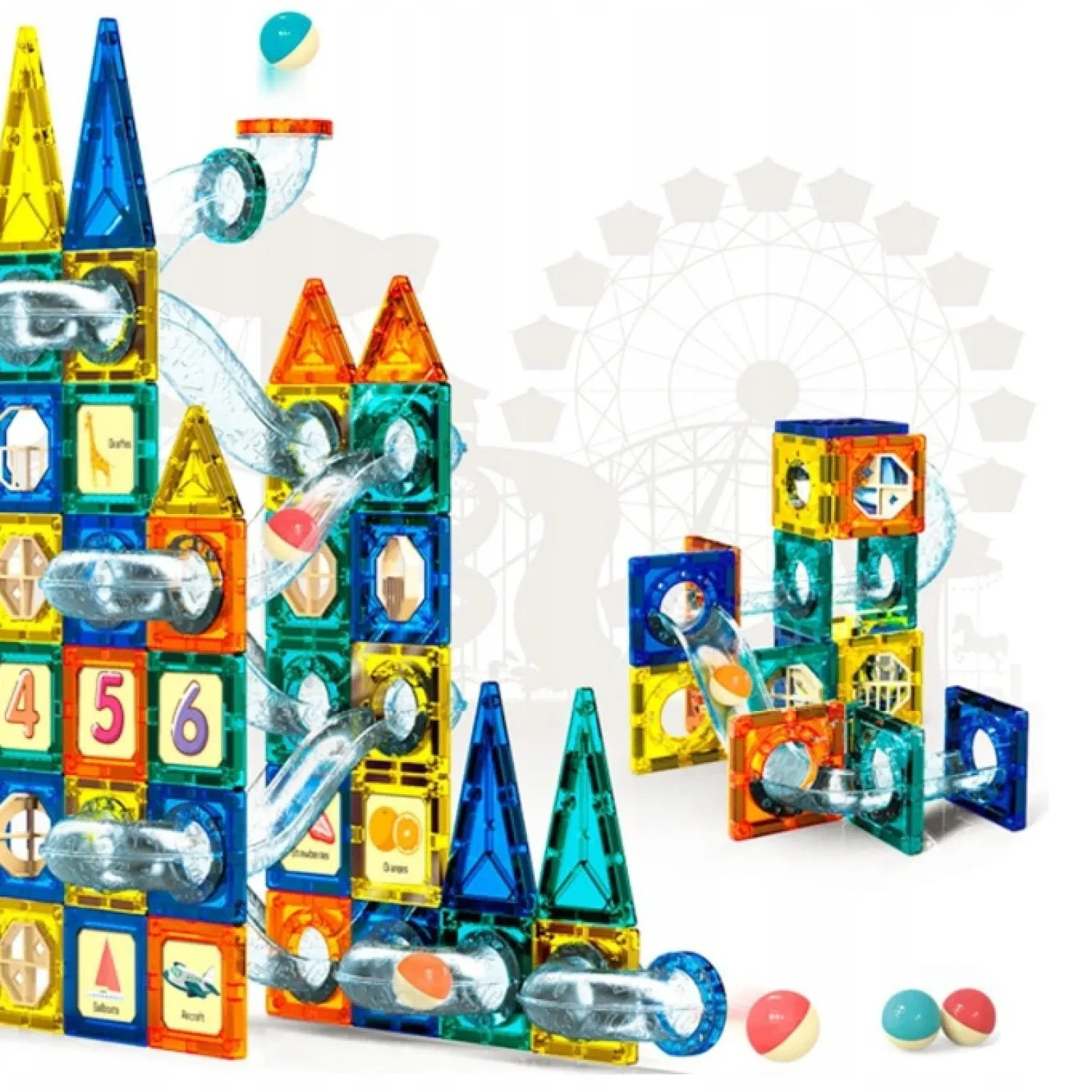 Set sadrži 139 dijelova: šarene magnetne kocke u četiri boje (narančasta, žuta, zelena i tamnoplava), prozirne dijelove za kuglični tobogan, naljepnice s brojevima i prijevoznim sredstvima te osam kuglica za igru. Zahvaljujući prozirnim elementima, djeca mogu promatrati kretanje kuglica kroz tunele i učiti o gravitaciji i brzini.