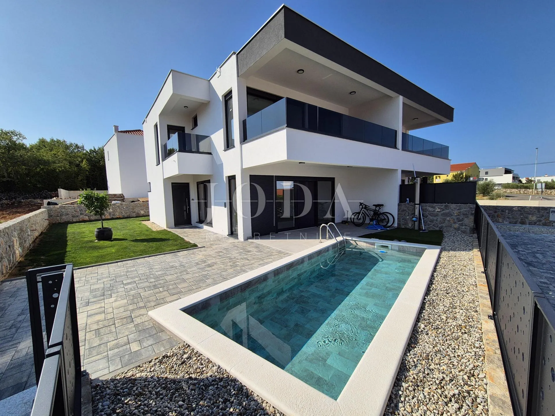 Prodaje se dvojna kuća u novogradnji, s bazenom i okućnicom - Malinska, otok Krk Nekretnina ima površinu 156 m2 a proteže na prizemlje i kat. U prizemlju su predsoblje, garderoba, kupaonica i veliki otvoreni prostor koji objedinjuje dnevni boravak, kuhinju i blagovaonicu te natkrivena terasa površine 15 m2. Na katu se nalaze hodnik, garderoba, tri spavaće sobe, svaka sa svojom kupaonicom i dva balkona. Kuća se prodaje po sistemu ključ u ruke, s uređenom okućnicom s bazenom i dva parkirna mjesta. Kvalitetna gradnja s podnim grijanjem po sistemu toplinske pumpe, PVC stolarija s roletama, klimatizacija svih prostorija. Useljenje se planira na ljeto 2024.godine. PDV u cijeni, prilika! ID KOD AGENCIJE: EI-5456 Josip Šikić, mag.oec Agent s licencom Mob: +385 91 890 4694 Tel: +385 51 403 771 E-mail: info@joda-nekretnine.hr www.joda-nekretnine.hr
