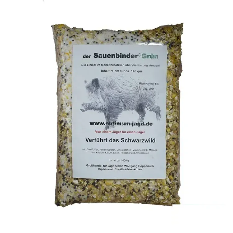 Der Sauenbinder GRUN mamac za divlje svinje. Napokon možete zadržati svinje tamo gdje ih želite. Pomoću ove mješavine možete namamiti svinje na određeno mjesto. Možete ih koristiti uz svoje normalno hranjenje. Koristite ga jednom mjesečno. Najbolje ga koristiti za vrijeme kišnih dana ili na mokrom tlu. Der Sauenbinder se kroz kišu širi u zemlju i aromatizira. To privlači svinje svojim mirisom i počinju kopati po tlu, pa ostaju duže vrijeme.