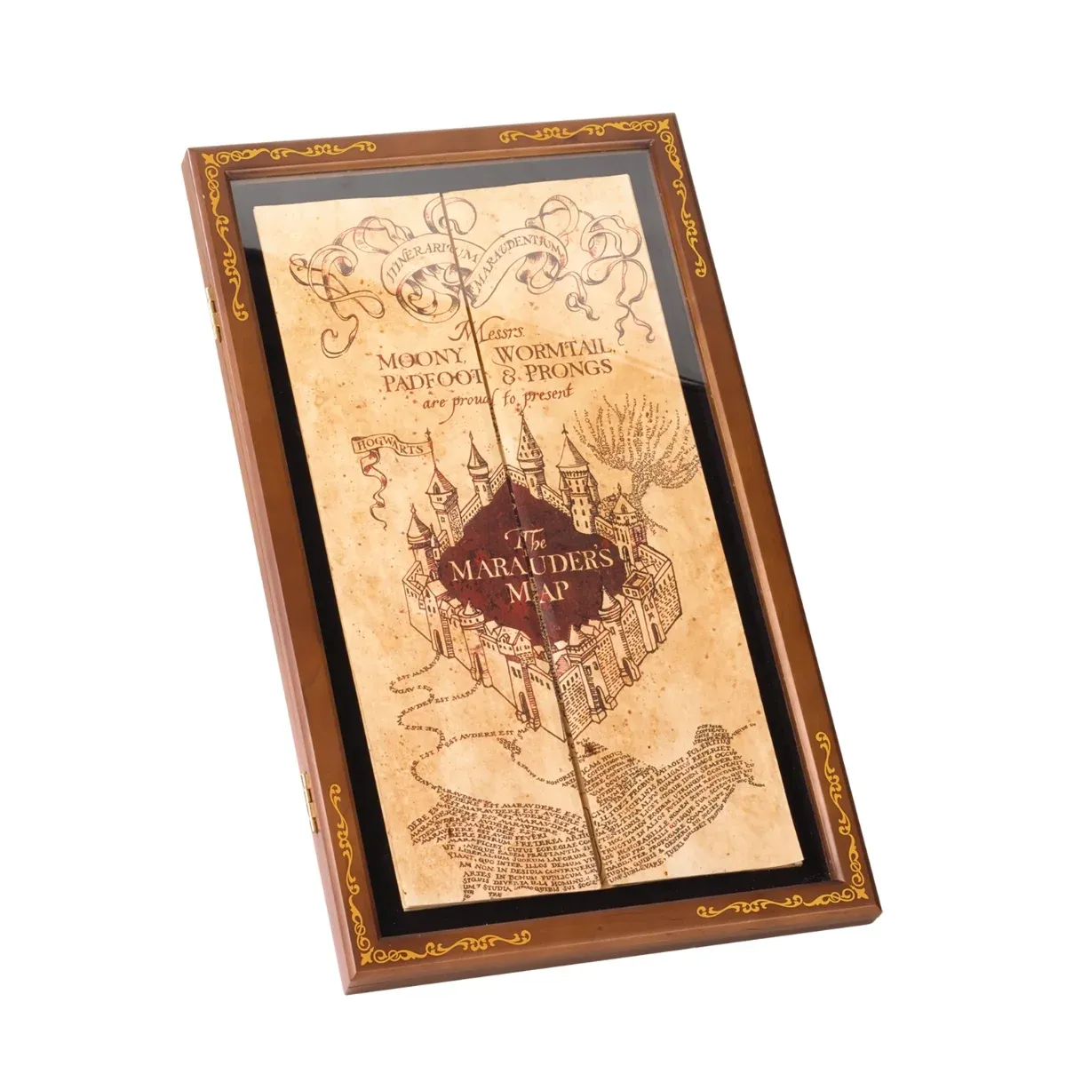A wooden display case for the Marauder’s Map, with intricate golden detailing and a hinge & clasp opening. Map sold separately.