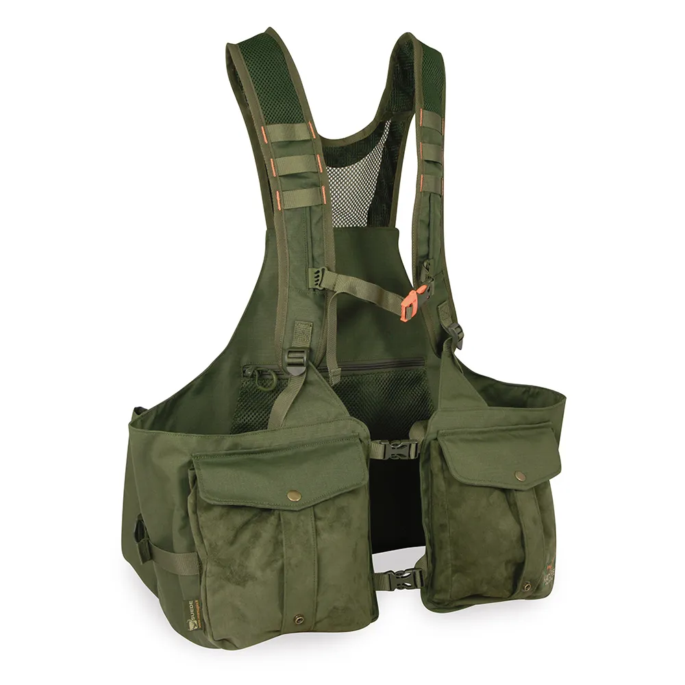 Udoban lovački prsluk za sve ljubitelje lova. Prsluk SUEDE JUNGLA PRO sadrži podesive prozračne naramenice s omčama za alat i prsni remen sa zviždaljkom za hitne slučajeve. Također ima 2 prednja džepa i jedan unutarnji džep od mreže kako bi se osigurala dobra ventilacija leđa. Opremljen je širokim stražnjim džepom za pohranjivanje divljači, 2 unutarnja džepa i 3 uklonjive trake visoke vidljivosti (2 sprijeda i 1 na stražnjoj strani) i 2 uklonjive trake za nošenje na ramenu.