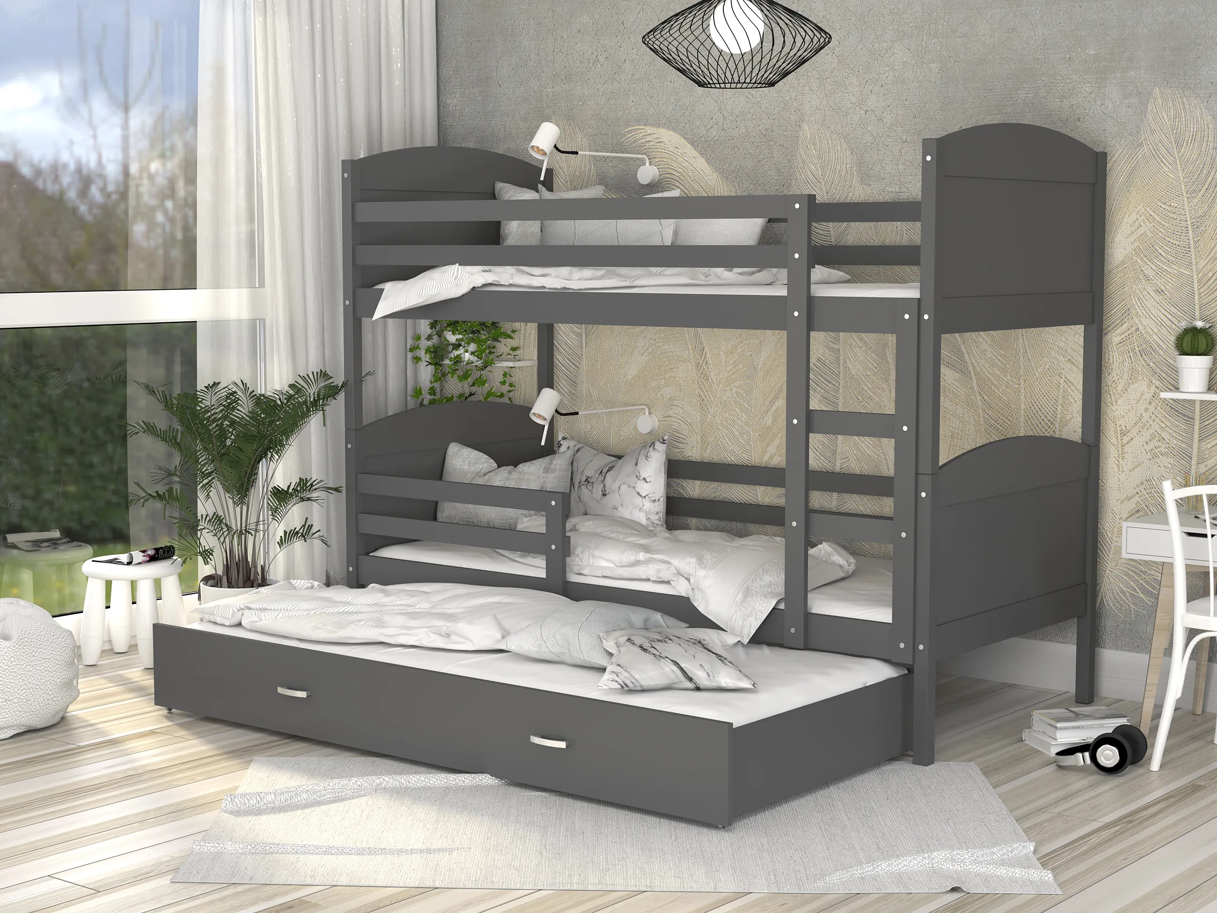 Dječji krevet Mateusz 3 s tri ležaja izrađen je od kvalitetne MDF ploče koje je poznato po svojoj izdržljivosti. Izdržljivost kreveta je zasigurno najveća vrlina svakog dječjeg kreveta jer neizostavne aktivnije i vrckave igre u krevetu neće nimalo naštetiti mališanima.
