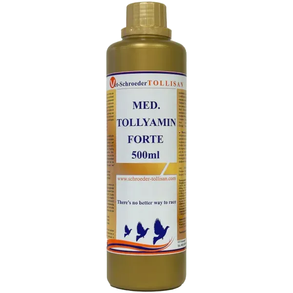 Visoka doza vitamina B-12 podržava pravilno stvaranje krvnih stanica i prokrvljenost, što je od izuzetne važnosti a drugi slični preparati ne donose tu količinu. Ovakvim tretmanom svojim pticama pružate dodatnu otpornost,a time i jačanje imuniteta što dovodi do velikog otpora na bolesti. Tijekom sezone natjecanja dodatak Med. Tollyamin Forte je neophodan kako bi se golubovi nakon natjecanja što brže oporavili jer tijekom natjecanja izgube mišiće i težinu. Dokazano je da golubovi koji koriste Med. Tollyamin Forte mnogo brže povrate svoju težinu i mišićnu masu.