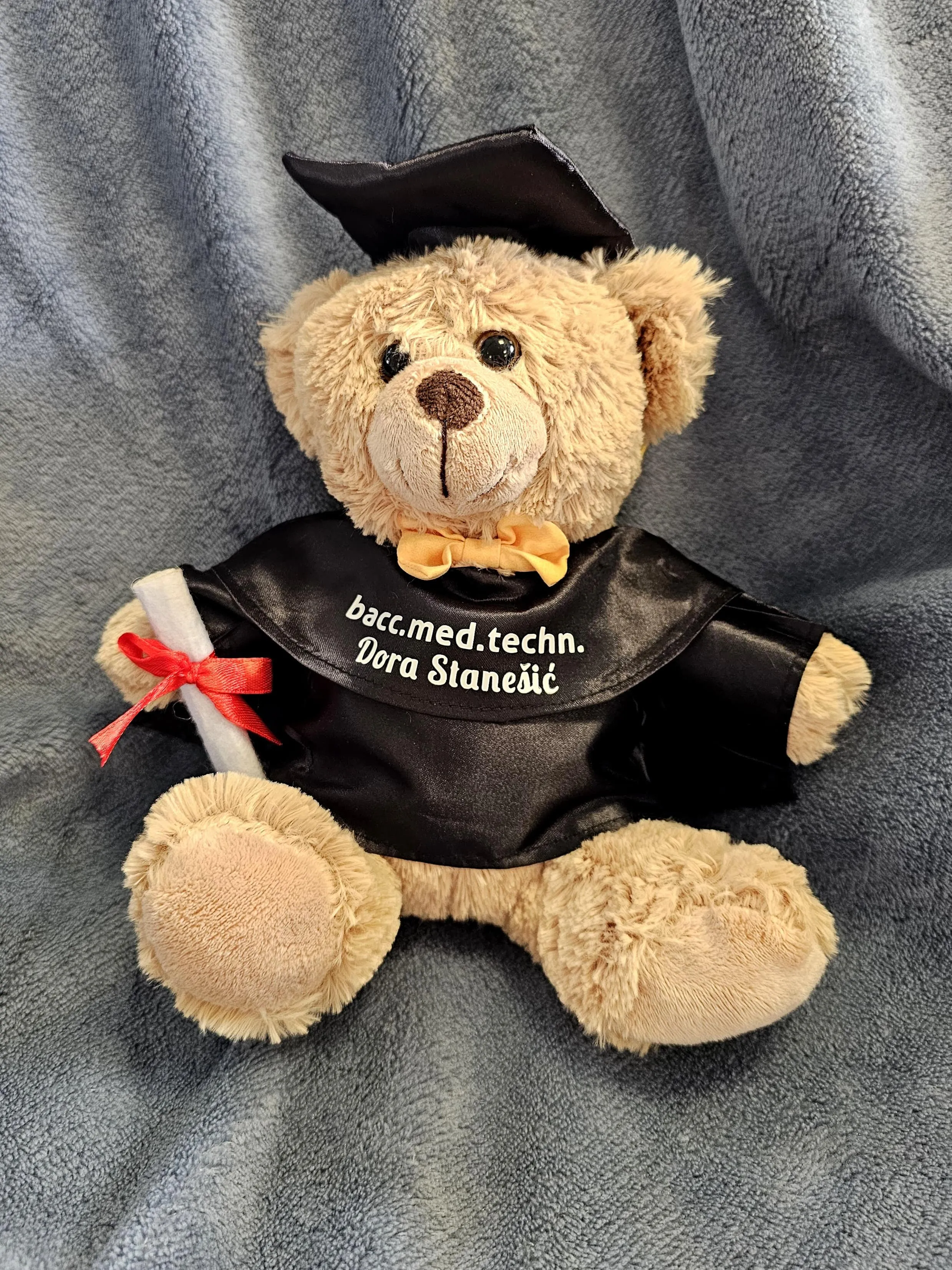 Plišani medo s diplomskim odjelom i kapom te diplomom u ruci idealan je poklon za promociju.