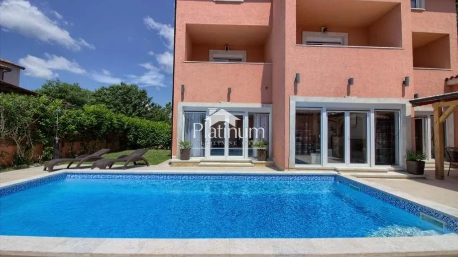 Prodaje se kuća s bazenom na tri etaže u Medulinu ukupne površine 380 m2. U prizemlju je veliki dnevni boravak sa kaminom, kuhinja i blagavaona, spavaća soba s kupaonom. Izlaz na bazen je omogućen iz dnevnog boavka kao i spavaće sobe. Na prvom katu su tri spavaće sobe svaka sa kupaonom i velika terasa na kojoj je jacuzzi. Dok su se na drugom na katu smjestile još dvije spavaće sobe sa zasebnim kupaonama. Okućnica je kompletno ograđena na kojoj je veliki bazen od 40 m2 pored kojeg je sunčalište i nakrivena terasa sa grillom. Udaljenost od mora 350 m.
