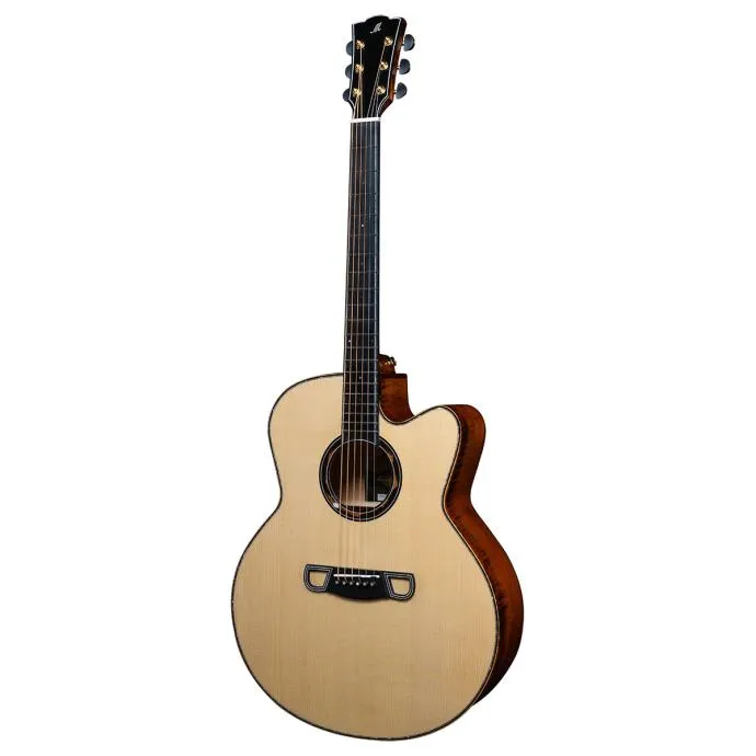 Akustična gitara jumbo oblika s punom prednjom pločom od masivne Europske smreke i tijelom od plamenog masivnog javora.