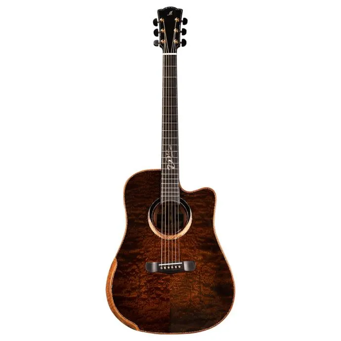 Akustična gitara dreadnought oblika s punom prednjom pločom od masivne smreke s furnirom od quilted sapelea i tijelom od quilted sapelea.