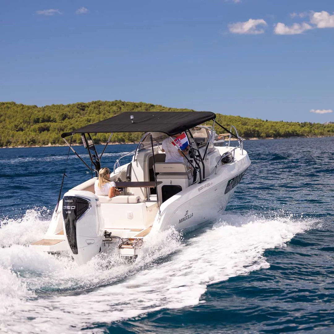 Mingolla Brava 28 WA je elegantan walkaround brod stvoren za udobnost, užitak i svestranost na moru. Sa svojih 8,15 metara dužine i 2,75 metara širine, nudi prostran raspored s prilagodljivim kokpitom, velikim sunčalištem na pramcu i praktičnom komandnom konzolom s ugrađenim sudoperom i kuhalom. Ispod palube nalazi se kabina pune visine s bračnim krevetom i odvojenom kupaonicom – savršena kombinacija za opuštene dnevne izlete ili duža krstarenja s potpunom udobnošću.
