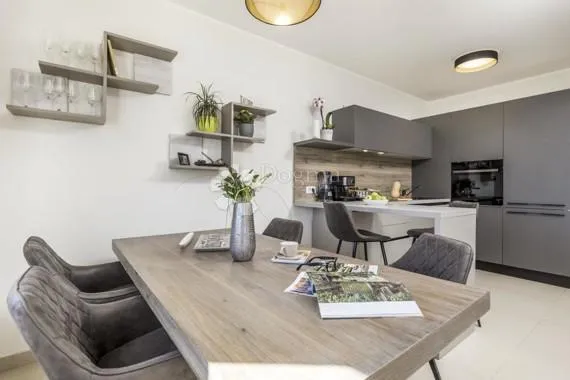 Na prodaju je prostran, kvalitetno uređen i odmah useljiv stan ukupne površine 84,13 m², smješten u prizemlju moderne stambene zgrade iz 2018. godine u mirnom i uređenom dijelu Marčelja. Rijetko dostupna nekretnina ovakvog tipa predstavlja izvrsnu priliku za sve koji traže ugodan obiteljski dom izvan gradske vreve, ali i za investitore koji prepoznaju vrijednost nekretnine s dodatnim sadržajima i velikim potencijalom za turistički najam. Stan je promišljeno organiziran kao 2S+DB i sastoji se od hodnika, dviju komfornih spavaćih soba, moderne kupaonice s podnim grijanjem, te velikog otvorenog prostora koji povezuje kuhinju, blagovaonicu i dnevni boravak. Iz dnevnog dijela izlazi se na balkon i natkrivenu terasu opremljenu vertikalnim tendama koje pružaju privatnost i zaštitu od sunca, čineći je savršenim prostorom za boravak na otvorenom tijekom većeg dijela godine. Poseban ugođaj stanu daje peć na drva, dok je sigurnost i cjelogodišnja ugodna temperatura osigurana ugrađenim klima inverterom za grijanje i hlađenje. Stan se prodaje potpuno namješten (osim namještaja na terasi), s pažljivo odabranim bojama i uređenjem do najsitnijeg detalja, što ga čini spremnim za momentalno useljenje bez dodatnih ulaganja. Pripada mu vanjsko parkirno mjesto, a zahvaljujući velikoj parceli oko zgrade, parkinga uvijek ima dovoljno i za stanare i za njihove goste. Zgrada je prizemna i lako dostupna, čineći stan pogodnim i za starije osobe, invalide ili teško pokretne osobe. Posebna vrijednost ove nekretnine leži u zajedničkoj okućnici koju koriste samo stanari zgrade. Uređeno dvorište, bazen dostupan djeci i odraslima te ugodan lounge prostor za druženje stvaraju jedinstven ambijent i dodatnu kvalitetu života. Ovakav spoj mirne lokacije, funkcionalnog rasporeda, dodatnih sadržaja i modernog uređenja čini stan izuzetno privlačnom i rijetkom ponudom na tržištu. Ova nekretnina idealna je prilika za sve koji žele kvalitetan život izvan grada, u okruženju koje pruža sigurnost, mir i sadržaje koji se rijetko nalaze u ovakvom cjenovnom razredu, a s obzirom na hitnu prodaju – prilika je koju ne treba propustiti, stoga nam se javite za razgled i priuštite si stan iz snova! Kontakt: Iris Kramaric Telefon: +385 91 338 8220 E-Mail: iris.kramaric@dogma-nekretnine.com ID KOD AGENCIJE: 1512773 Iris Kramarić Agent s licencom Mob: 091/338-8220 Tel: 01/211-0039 E-mail: iris.kramaric@dogma-nekretnine.com www.dogma-zagreb.com