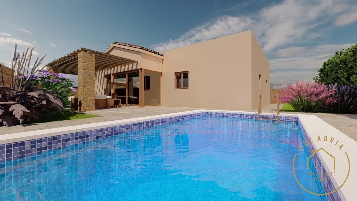 2 kupaonice, WC-a, ostave. U dvorištu od cca 400 m2 nalazi se natkrivena terasa i bazen ( 18 m2 )