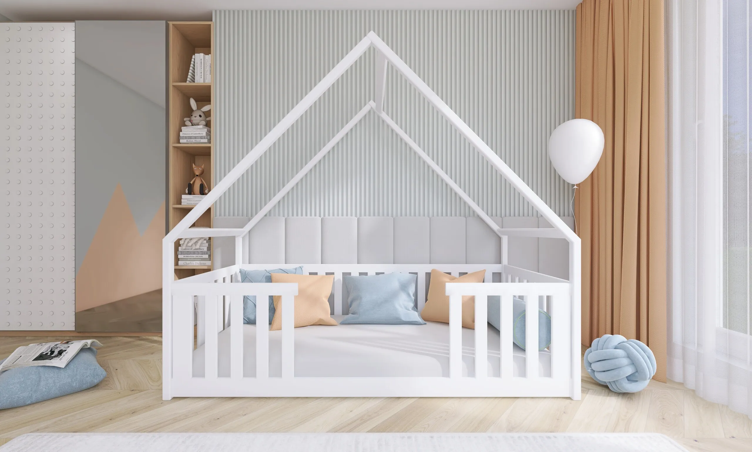 Zahvaljujući konstrukciji, Montessori niski krevet kućica idealan je za malu djecu, jer omogućava sigurno penjanje i silazak, dok dodatne ogradice osiguravaju maksimalnu zaštitu i miran san. Ulaz smješten u sredini omogućuje jednostavan pristup krevetu bez straha od pada, čineći ga savršenim rješenjem za prve dječje avanture u vlastitom krevetu.