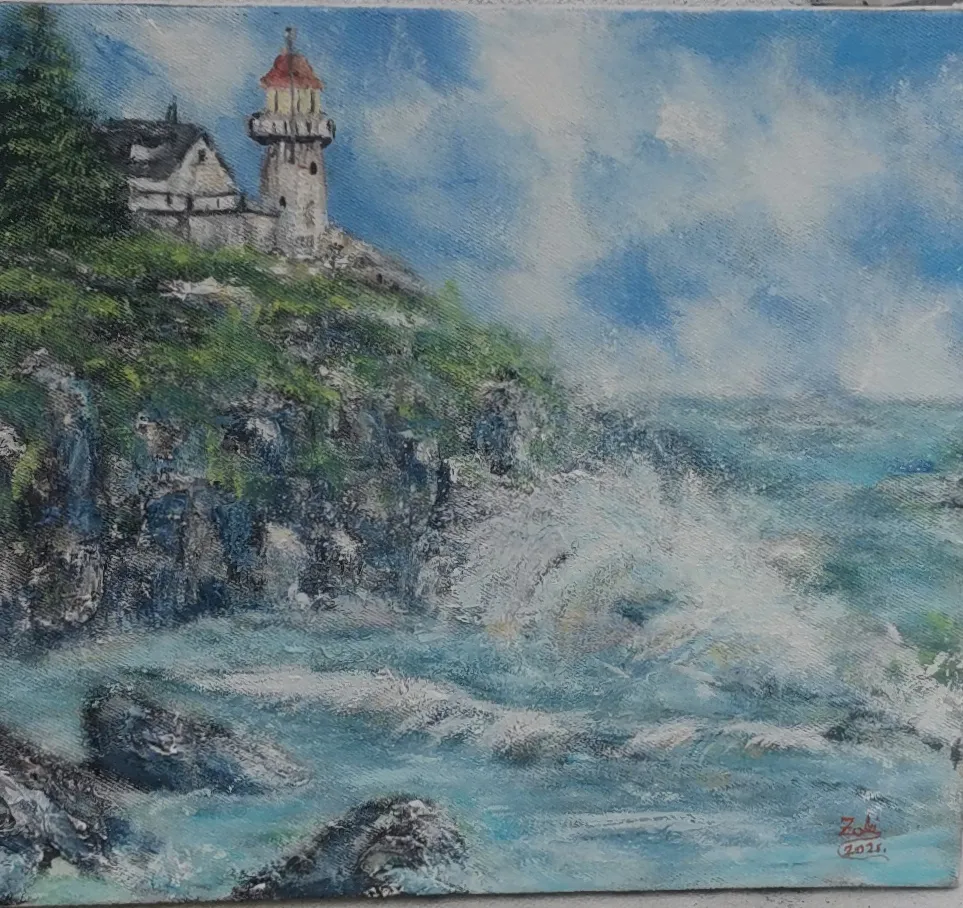 Prodajem sliku Morski pejzaž s svjetionikom- Ulje na platnu veličine 44,5 x 39 cm