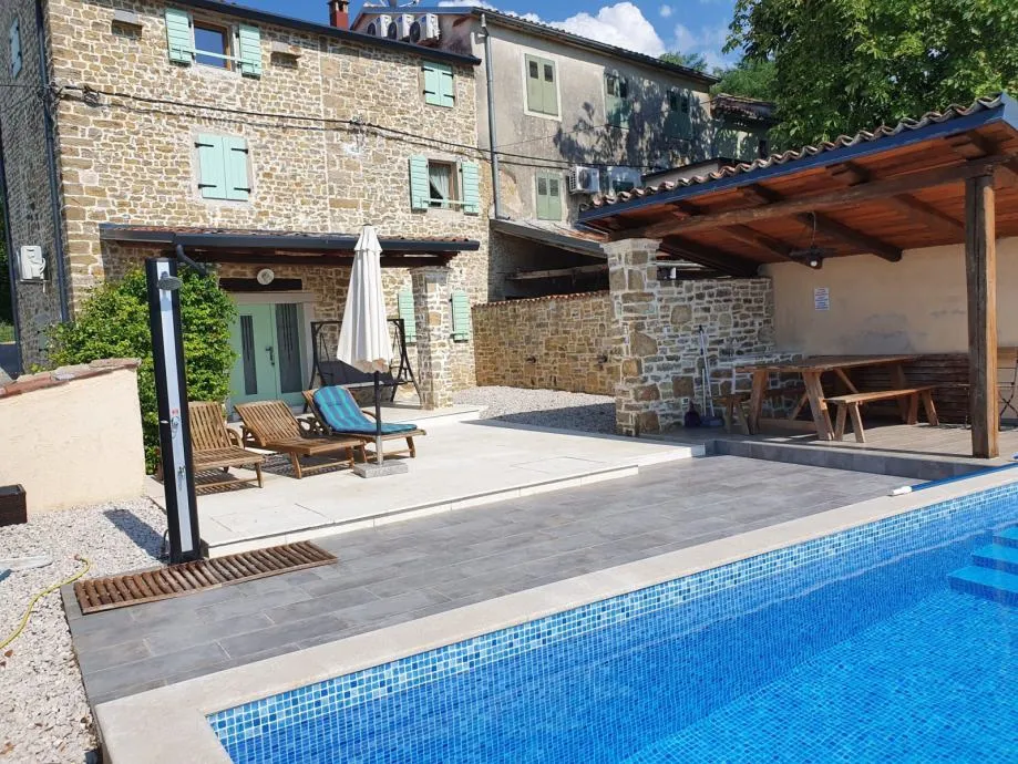 Nedaleko Motovuna prodaje se renovirana kamena kuća sa bazenom i apartmanom . Glavna kuća ima svoju okućnicu, bazen, terase, parking te se sastoji od prizemlja, kata i visokog potkrovlja. U prizemlju je smješten dnevni boravak, blagovaona i kuhinja, te wc . na prvom katu su smještene dvije prostrane spavaće sobe sa pogledom na Motovun, i zajedničko kupatilo, dok se u visokom potkrovlju nalazi jedna velika spavača soba i kupatilo također sa otvorenim pogledom na Motovun. Kuća je kompletno renovirana . Sa stražnje strane je mali apartman koji u prizemlju ima veliku terasu, dnevni, blagovoanu i kuhinju , te spavaću sobu i kupaonu na katu. Grijanje je na klima uređaj