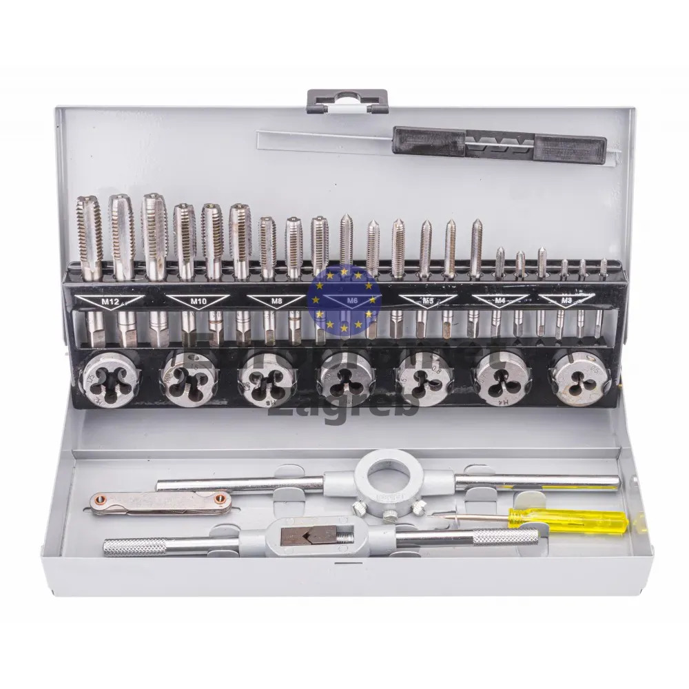 Komplet nareznica i ureznica izrađen od čelika s ručkama, dizajniran za ručno narezivanje/urezivanje navoja. Komplet sadrži navoje od M3-M12, ispitivač za mjerenje navoja i odvijač. Sve je to upakirano u metalno kućište za jednostavno skladištenje i transport.
