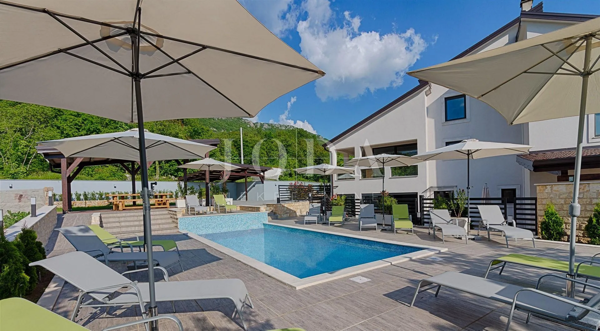 Prekrasna moderna vila na mirnoj lokaciji. Karakterizirana svojim jedinstvenim dizajnom, ova suvremena vila nudi nenadmašan stil i funkcionalnost. Villa se prostire na 350 m2 i sastoji se od prizemlja, prvog i drugog kata. Ima 3 spavaće sobe sa pripadajućim kupaonicama na prvom katu, a jednosoban stan na drugom katu. Prostrani dnevni boravak i vrhunski opremljena kuhinja s blagovaonicom nalazi se u prizemlju kuće. U prizemlju kuće nalazi se i unutarnji bazen i sauna. Iz dnevnog boravka izlazi se na terasu sa ljetnom kuhinjom i lounge dijelom koji je udaljen svega par koraka od atraktivnog bazena i sunčališta. Kompletno namještena. Na uređenoj okućnici površine 1313 m2 nalaze se nekoliko parkirnih mjesta. Mirna i lijepa lokacija, 3 km od mora. ID KOD AGENCIJE: EI-217