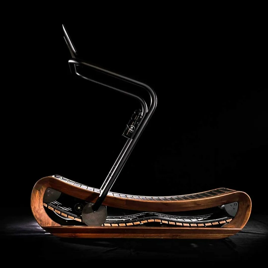 SPRINTBOK by NOHrD izdvaja se od konvencionalne trake za trčanje svojim zakrivljenim, laganim oblikom s elegantnim drvenim okvirom i površinom za trčanje s letvicama.