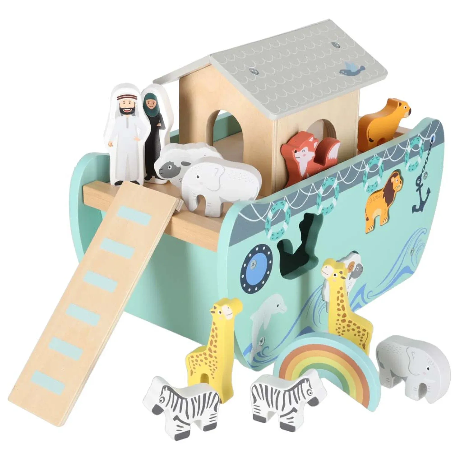 U setu se nalaze pažljivo izrađene figurice životinja. Svaka životinja dolazi u paru, što prati originalnu priču o spašavanju životinja. U setu su zebre, žirafe, slonovi, ovce, lavovi i lisice. Figurice Noe i njegove žene dodaju mogućnost igranja uloga i stvaranja vlastitih priča.