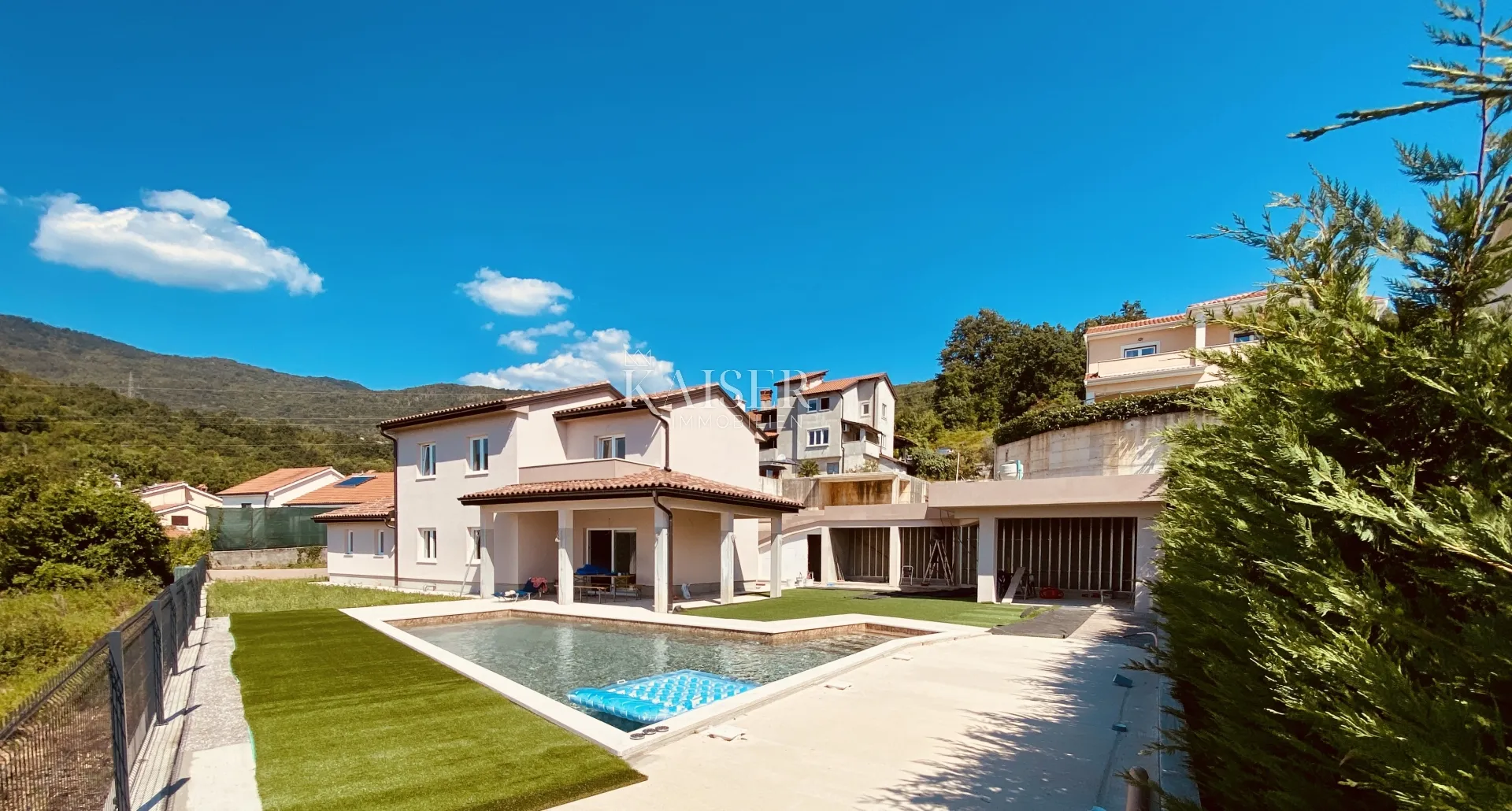 Opatijska agencija za nekretnine Kaiser Immobilien stavlja na tržište lijepu novoizgrađenu obiteljsku kuću s bazenom koja se nalazi u naselju Bregi iznad Opatije. Kuću je gradio sam investitor za vlastite potrebe i korišteni su najbolji materijali, PVC stolarija, podno grijanje, dizalice topline, 5 unutarnjih klima itd. Kuća nudi stambenu površinu od 167 m2 s ukupno 5 soba od kojih su 3 spavaće. U prizemlju se nalazi veliki dnevni boravak s kuhinjom po mjeri, blagovaonicom i izlazom na natkrivenu verandu uz bazen s otvorenim pogledom na more i okolne planine. Ovdje ćete pronaći još jedan prostor namijenjen za kućnu teretanu, saunu, igraonu ili četvrtu spavaću sobu sa zasebnom kupaonicom, skladište i kotlovnica s praonicom. Na prvom katu nalaze se ukupno 3 spavaće sobe i 2 kupaonice. Kući pripada okućnica od 638 m2 s bazenom od 50 m2 (elektroliza – tretman vode solju, masažne mlaznice, kontra struja) te velika natkrivena vanjska kuhinja s pripadajućom kupaonicom i wc-om. Tu su i parkirna mjesta za više automobila te postavljen je video nadzor. Kuća ima prekrasan pogled na more i okolne šume. Trenutno su u tijeku završni radovi. Opatija: 5 km Matulji: 4 km Rijeka: 12 km Trgovina: 1 km Zračna luka Rijeka: 40 km Zračna luka Pula: 90 km ID KOD AGENCIJE: 101-002 Jirka Nerad Agent s licencom u posredovanju u prometu nekretnina Mob: +385911632884, +385995677888 E-mail: jirka@kaiser-immobilien.hr www.kaiser-immobilien.hr