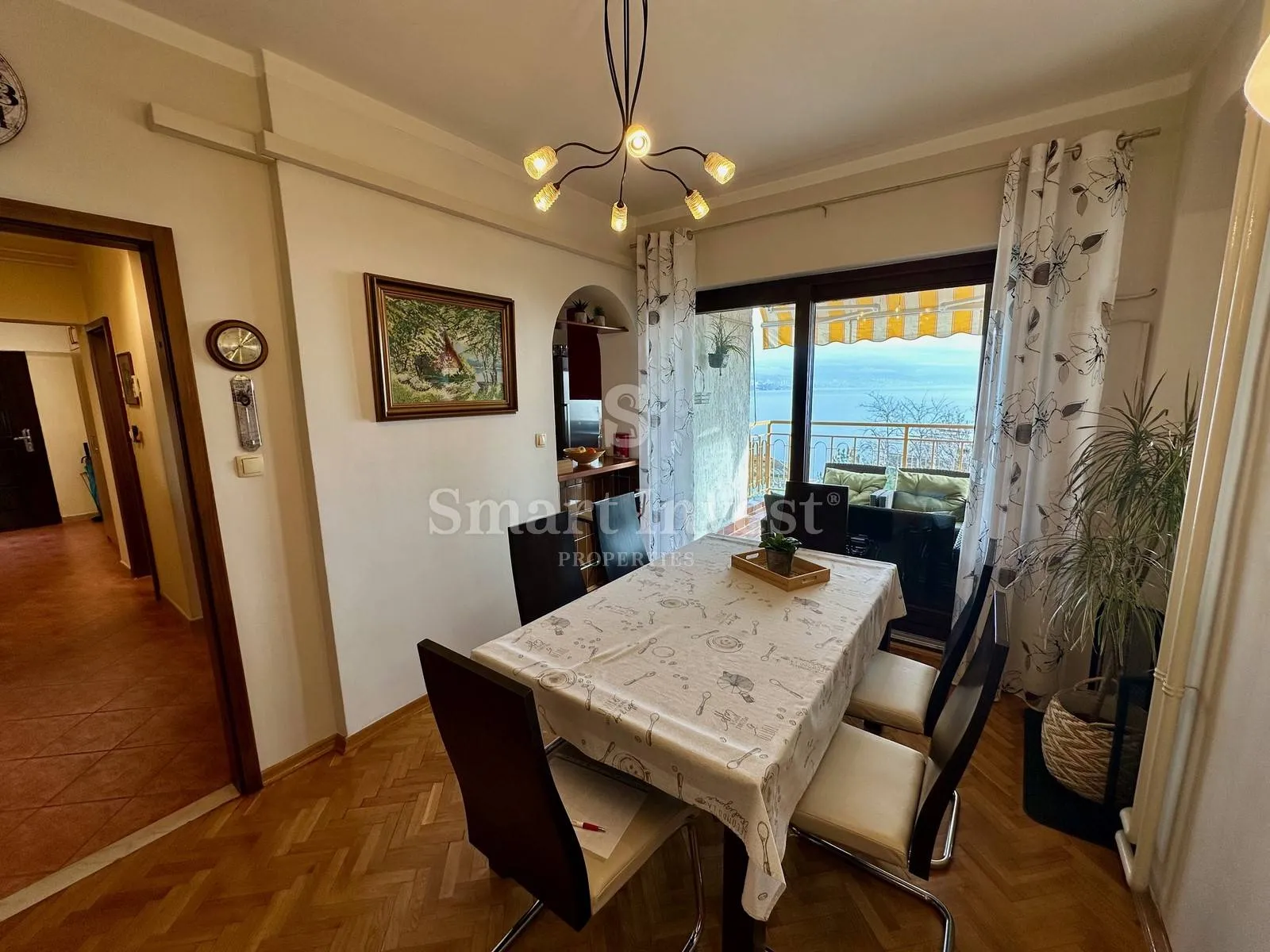 OPATIJA, na prodaju je prostran stan 3S+DB s balkonom i pogledom na more u blizini mora i svih sadržaja! Stan se nalazi na drugom katu stambene zgrade sa tri stana te ima zaseban ulaz. Sastoji se od ulaznog hodnika, dnevnog boravka, blagovaonice, kuhinje sa ostavom, tri spavaće sobe i dvije kupaonice. Stan je južne orijentacije, pun dnevne svjetlosti te ima prekrasan pogled na more. Kompletno je uređen i namješten te se kao takav i prodaje. Grijanje je centralno etažno na peć na pelete a u stanu su postavljene i inverter klime. Na zajedničkoj okućnici nalazi se vrt za druženje i parkirno mjesto. Odlična mirna lokacija, svega 10 minuta šetnje udaljena od mora i centra Opatije sa svim sadržajima. Za više informacija i razgled nazovite +385/99/320-0008 ID KOD AGENCIJE: 15347 Katarina Žiganto Agent s licencom Mob: +385/91/3200021 E-mail: katarina@smart-invest.hr www.smart-invest.hr Denis Dizdar Agent s licencom Mob: +385/91/320-0040 E-mail: denis@smart-invest.hr www.smart-invest.hr