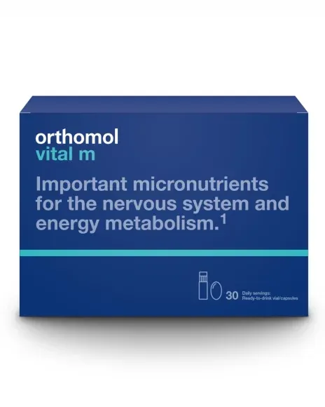 Opis proizvoda: Orthomol® Vital m je dodatak prehrani. Važni mikronutrijenti za živčani sustav i metabolizam energije s magnezijem i B vitaminima za smanjenje umora i iscrpljenosti te omega-3 masnim kiselinama.