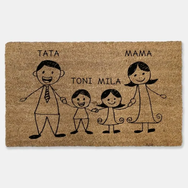 Otirač s aplikacijom ilustracija obitelji s imenima po izboru. Dovoljno je šiljast da bi cipile bile čiste.