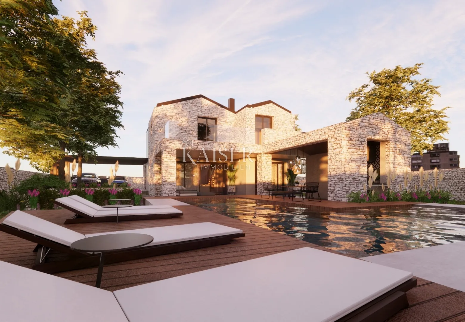 Kaiser immobilien predstavlja luksuznu modernu kamenu villu koja se nalazi na prekrasnoj lokaciji. Villa je smještena u idiličnom gradu Krku u Hrvatskoj na zapadnoj strani zlatnog otoka Krka koji je mostom povezan sa kopnom. Villa će biti izgrađena i useljiva do kraja 2023. godine na parceli od cca 900 m2, stambene površine od 227 m2. U prizemlju nalaze se dnevni boravak, blagovaonica, kuhinja, jedna spavaća soba i jedna kupaonica, te ostava. Na katu se nalaze tri spavaće sobe svaka s kupaonicom, a iz dvije sobe se izlazi na prostranu terasu. Sa terase ali i mediteranski uređene okućnice s maslinama i grmovima lavande te prekrasnim bazenom, možete uživati u fantastičnom pogledu na more i antički grad Krk. Ova luksuzna villa tehnički je prvoklasno opremljena i između ostalog ima podno grijanje, klimu, ljetnu kuhinju, bazen, alarmni sustav, parkete i kamene podove. Do obale mora udaljenost je cca 750 m, a do centra grada s restoranima, trgovinama, barovima, kafićima i ostalim sadržajima lako se stiže pješice za 800 m. ID KOD AGENCIJE: 105-78 Lado Patekar Agent s licencom u posredovanju u prometu nekretnina Mob: +385919390220, +385995677888 E-mail: lado@kaiser-immobilien.hr www.kaiser-immobilien.hr