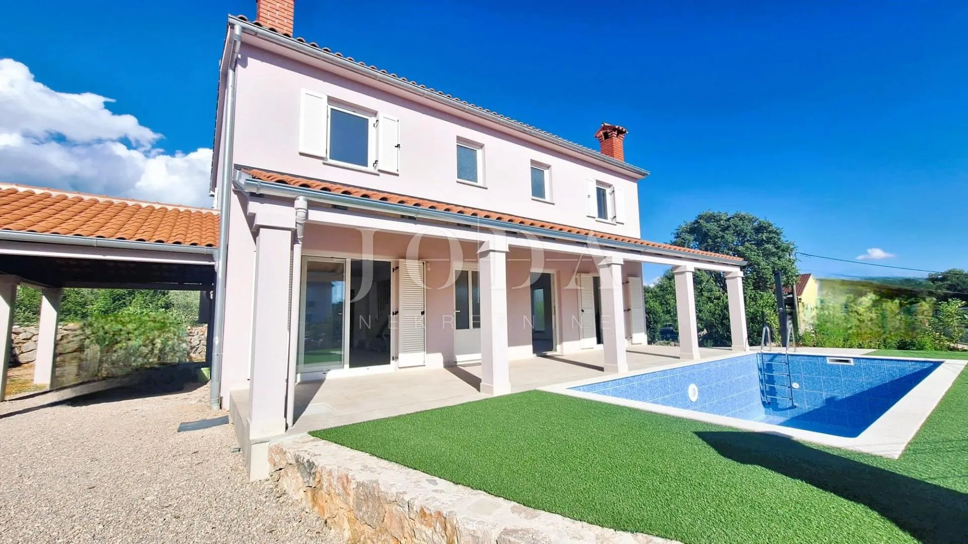 Otok Krk - nova kuća s dvije stambene jedinice i bazenom. Prodaje se nova samostojeća kuća s dva dvoetažna stana. Svaka stambena jedinica u prizemlju ima open space dnevni boravak, kuhinju, blagovaonicu, kupaonicu, izlaz na terasu i okućnicu sa bazenom i sunčalištem, dok su na katu po dvije spavaće sobe, spremište, kupaona. Mirna lokacija cca 2,5 km od mora (4 minute vožnje), idealno za veće obitelji! ID KOD AGENCIJE: EI-5913