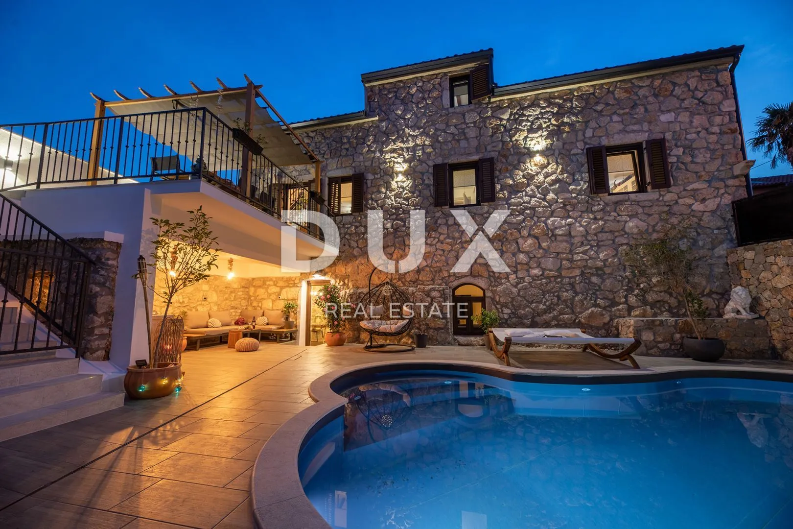 Otok Krk - Luksuzna kamena vila s bazenom, tek 1500 m od mora. U prizemlju objekta se nalazi konoba u kojoj možete provoditi ugodno društvo s prijateljima igrajući biljar ili pikado, dok se u prostoriji do nalazi sauna i teretana. S velike terase na prvom katu ulazi se u dnevni boravak, kuhinja s blagovaonicom, kupaonica i spavaća soba. Unutrašnjim stepenicama ide se na drugi kat gdje se osim galerije smjestio dnevni boravak, dvije spavaće sobe, kupaonica i predivna terasa. U ograđenom dvorištu nalazi se bazen, sunčalište s tušem i grill. Ovaj predivni objekt ima četiri parkirna mjesta. Ako ste željni mira i pravog odmora ovo je pravi objekt za vas. Na istočnoj strani otoka Krka smještena je općina Dobrinj s istoimenim središtem. Dobrinj se nalazi ne brežuljku visokom oko 200 metara i jedan je od srednjovjekovnih kaštela koji su u prošlosti bili središta pismenosti. Dobrinjština je stoljećima bila izrazito poljoprivredni kraj. Bilo je zastupljeno i stočarstvo te maslinarstvo kao i iskorištavanje šumskog bogatstva. Mjesto je poznato i po živopisnoj narodnoj nošnji, folklornim manifestacijama, školi sopela ( krčki puhački instrument ) te tradicionalnoj domaćoj kuhinji. U ovom otočnom središtu prevladavaju autohtone kamene kuće i uske kamene ulice koje odišu prošlim vremenima. Nedaleko Dobrinja nalazi se špilja Biserujka koja oduševljava svojom ljepotom i zanimljivošću istaloženih oblika. To je jedina špilja na otoku, od njih više od 50, uređena za prijam posjetitelja. Prema legendi, špilja je ime Biserujka (biser) dobila prema blagu koje je u njoj pronađeno, a pripadalo je lokalnim gusarima. Poštovani klijenti, agencijska provizija naplaćuje se u skladu s Općim uvjetima poslovanja www.dux-nekretnine.hr/opci-uvjeti-poslovanja ID KOD AGENCIJE: 10209 DUX Nekretnine Mob: +385 91 480 8808 Tel: +385 99 640 8438 E-mail: info@dux-nekretnine.hr www.dux-nekretnine.hr