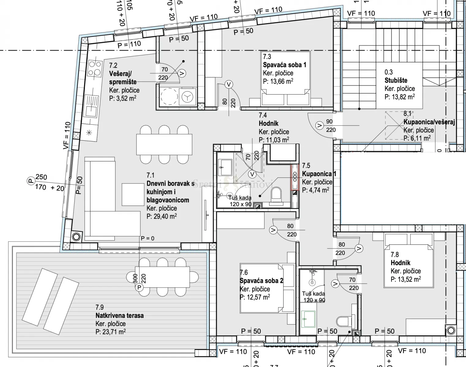 Prodaje se penthouse stan s pogledom na more na 3. katu (zadnji kat) u modernoj novogradnji u gradu Vodice, na lijepoj lokaciji u blizini svih sadržaja potrebnih za ugodan život - trgovine, ugostiteljski objekti, supermarketi. Do centra grada Vodice i mora ima oko 3 minute vožnje, to jest oko 12 minuta hoda, do plaže Male Vrulje oko 6 min vožnje (oko 20min hoda), a Plave plaže oko 6 min vožje (oko 25 min hoda). Osnovna škola je na oko 3 minute vožnje (oko 15 minuta hoda), a vrtić se nalazi na oko 6 minuta vožnje (oko 25min hoda). Ovaj stan u novogradnji Vodice sastoji se od ulaznog hodnika, 2 kupaonice, vešeraja/spremišta, 3 spavaće sobe i velikog dnevnog boravka s kuhinjom i blagovaonom, iz kojega se izlazi na veliku natkrivenu terasu s prekrasnim pogledom na more. Unutarnji dio stana ima 93,21 m2, dok natkrivena terasa ima 23,71 m2. Grijanje/hlađenje putem klima uređaja s unutarnjom jedinicom u svakoj sobi. Električno podno grijanje prolazi kroz kupaone (moguća ugradnja u ostatku stana po želji kupca, ovisno o fazi gradnje). Moguća je kupnja 2 parkirna mjesta. Parkirna mjesta kreću se od 12,50 m2 do 18,50 m2. __________ EN Exclusive Sea-View Penthouse With a Large Terrace in a Modern New Development in Vodice Penthouse apartment with sea view for sale on the 2nd floor (top floor) of a modern new building (ground floor+ 2 floors) in the town of Vodice, situated in a nice location close to all amenities necessary for comfortable living – shops, cafés, restaurants, and supermarkets. The town center of Vodice and the sea are approximately a 3-minute drive away (around a 12-minute walk). Male Vrulje Beach is about a 6-minute drive (approx. 20-minute walk), while Plava Beach is also about a 6-minute drive (approx. 25-minute walk). The primary school is approximately a 3-minute drive (15-minute walk), and the kindergarten is about a 6-minute drive (25-minute walk). This newly built apartment in Vodice consists of an entrance hall, 2 bathrooms, a laundry room/storage space, 3 bedrooms, and a spacious open-plan living room with kitchen and dining area, leading onto a large covered terrace with a beautiful sea view. The internal living area measures 93.21 m², while the covered terrace extends to 23.71 m². Heating and cooling are provided by air-conditioning units, with an indoor unit installed in each room. The bathrooms are equipped with electric underfloor heating (installation in the remaining areas of the apartment is possible upon buyer’s request, depending on the stage of construction). The purchase of two parking spaces is available. Parking spaces range from 12.50 m² to 18.50 m². ID KOD AGENCIJE: 7858 Andrea Zeneral Mob: 099 673 1949 Tel: 051/301-502 E-mail: andrea@sretnistanovi.hr www.sretnistanovi.hr