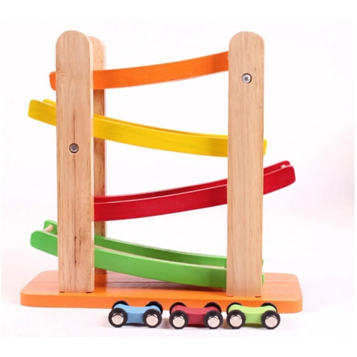 Pista na četiri razine i četiri drvena autića za spuštanje pistom odličan su poklon za djecu najmlađeg uzrasta.