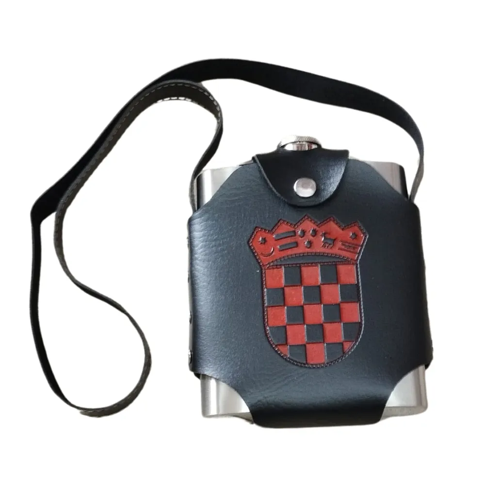 Pljoska od čelika u kožnoj torbicu crne boje sa Hrvatskim grbom lijepi je dodatak poklona za Hrvata, lovca, ribiča,poslovnog partnera…
