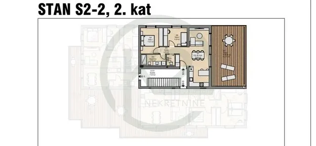 Prodaje se 3 - sobni stan u novogradnji S2-2. na 2. katu, korisne površine 107,09 m2, obračunske površine 72, 89 m2, nekoliko minuta od Jankomira. Stan se sastoji od: - Hodnika 2,95 m2 - WC 1,92 m2 -Dn. B.+blag.+Kuh. 29,90 m2 - Kuhinja 5,59 m2 - Soba 1 11,61 m2 - Soba 2 9,19 m2 - Kupaonica 5,92 m2 - Terasa 11,40 m2 UKUPNO: 72,89 m2 Uz stan je moguće kupiti GPM + ostava po fix. cijeni 30.000 € ili VPM + ostava po fix. cijeni 15.000 €. Stan se nalazi u zgradi broj 6 sa 14 stanova, VP+2 kata. Kupac je oslobođen plaćanja poreza na promet nekretnina i agencijske provizije!! Stanove odlikuje najviši stupanj opreme i najsuvremenije tehnologije u pogledu instalacija i upravljanja istima. Useljenje proljeće / 27. Energetski razred A+. armiranobetonska konstrukcija demit fasada debljine 12 cm termoizolacija ravnog krova stirodurom debljine 20cm grijanje: podno (dizalica topline) hlađenje: klima uređaj vrhunska pvc stolarija: podizno klizne stijenke, rolete na struju, komarice parkirna mjesta opremljena elektro punjačem za vozila na električni pogon Mirna lokacija okružena zelenilom i odlično povezana ostatkom s grada. U četvrti se nalaze svi osnovni sadržaji poput vrtića, osnovne škole, tržnice, doma zdravlja, policijske postaje, pošte, ljekarne, trgovine, trgovačkih centara te nekoliko izletišta i dječjih igrališta koja se nalaze u neposrednoj blizini, trgovački centar 5 minuta hoda. Položajem, sadržajima i prometnom povezanošću projekt ima kvalitete centra grada, dok svojim zatvorenim karakterom, razinom privatnosti i pogledom na zelenilo kojim je okružen nudi kvalitete mirnog obiteljskog naselja udaljenog od gradske vreve. Lokacija je odlična za rekreaciju i aktivan boravak u prirodi na livadama oko zgrade ili uz rijeku Savu te jezera Orešje i Rakitje koja se nalaze nedaleko zgrade. UDALJENOST POTREBNIH SADRŽAJA -trgovački centri 5 minuta hoda<br /> -pošta 6 minuta hoda<br /> -osnovna škola 7 minuta hoda<br /> -ljekarna 9 minuta hoda<br /> -Dom zdravlja 12 minuta hoda<br /> -Vrtić 15 minuta hoda Zgrada je odlično prometno povezana autobusnim, tramvajskim i željezničkim linijama koja se nalaze u krugu od 300m. Ostala su još 3 neprodana stana: -S0-2, dvosobni -S1-3, dvosobni -S1-6, trosobni Dodatne informacije na +385 91 518 4526, Vesna.<br /> K2 NEKRETNINE<br /> QBAT STUDIO d.o.o.