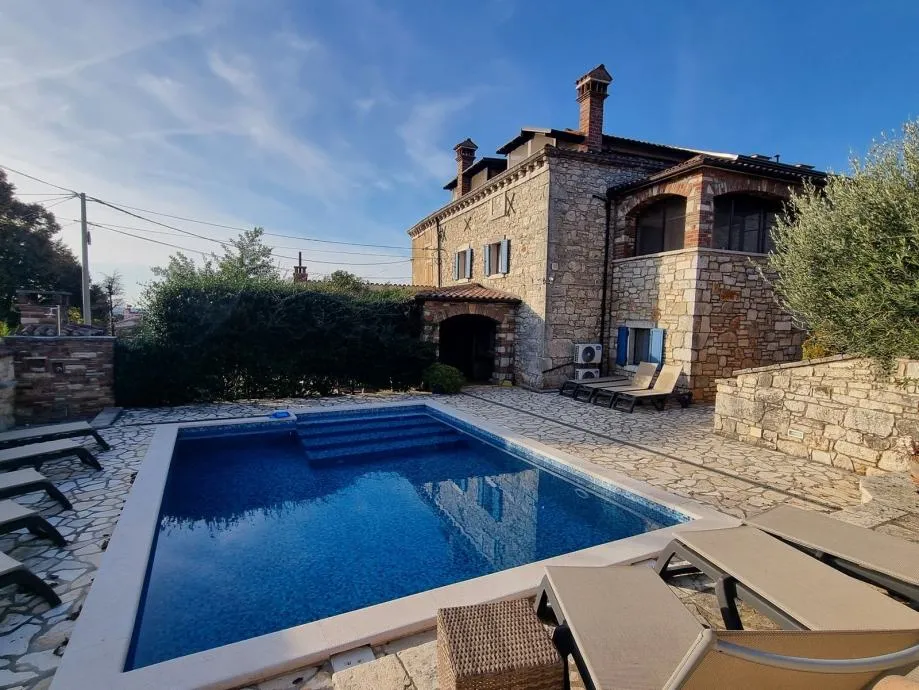Prekrasna kamena ljepotica od 175 m2 smjestila se u strogom centru jednog malog istarskog gradića nedaleko od Poreča, na zemljištu od 496 m2. Renovirana je 2011. godine. Sastoji od dvije odvojene stambene jedinice, te posebnog objekta sa wellness sadržajima. U prizemlju kuće nalazi se stan sa velikim dnevnim prostorom (dnevnim boravkom sa kaminom, blagovaonom i kuhinjom), zatim hodnikom koji vodi u dvije spavaće sobe i kupaonu. Ispred stana je prostrana natkrivena terasa za uživanje u toplim ljetnim danima. Kamenim vanjskim stubištem odlazi se u dvoetažni stan na katu koji se sastoji od ulazne natrkivene terase, dnevnog boravka sa kaminom, kuhinje, hodnika, spavaće sobe/garderobe, kupaone- na prvoj etaži, dok se stepenicama odlazi na drugu etažu gdje su smještene još dvije spavaće sobe svaka sa svojim balkonom, i kupaona. Sveukupno kuća ima 5 spavaćih soba, i 3 kupaone. U dvorištu postoji još jedan poseban mali objekat u kojem se nalazi jacuzzi, prostor za opuštanje i tuš. Grijanje je regulirano putem lož ulja- centralno i putem klimatskih jedinica, dok se struja, grijanje bazena i topla voda pokreću putem solarnih panela. Solarni paneli pune bateriju od 32 KW koja pokreće struju. Drugim riječima, grijanje kuće, tople vode i struja su vrlo ekonomični kod ove kuće! Uz kuću napravljen je i natkriveni parking, na čijem se krovu nalaze 4 solarna panela. Stolarija je aluminijska sa inox komarnicima. U dvorištu je smješten veliki grijani bazen, vanjski tuš, prostor za sunčanje, i vanjski kamin sa kompletom od drveta za sjedenje uz kamin. U vrtu je postavljan i sustav za navodnjavanje. Kuća ima video nadzor i alarm sistem koje je moguće upravljati na daljinu. Velika pogodnost ove kuće je ekonomičnost, no i veliki smještajni kapacitet, zbog čega može biti vrlo interesantna novim vlasnicima za turistički najam, ili za kombinaciju- dijela za najam, a dijela za cijelogodišnje življenje. Vrlo je bitno naglasiti da je lokacija kuće u samom centru mjesta sa svim sadržajima.