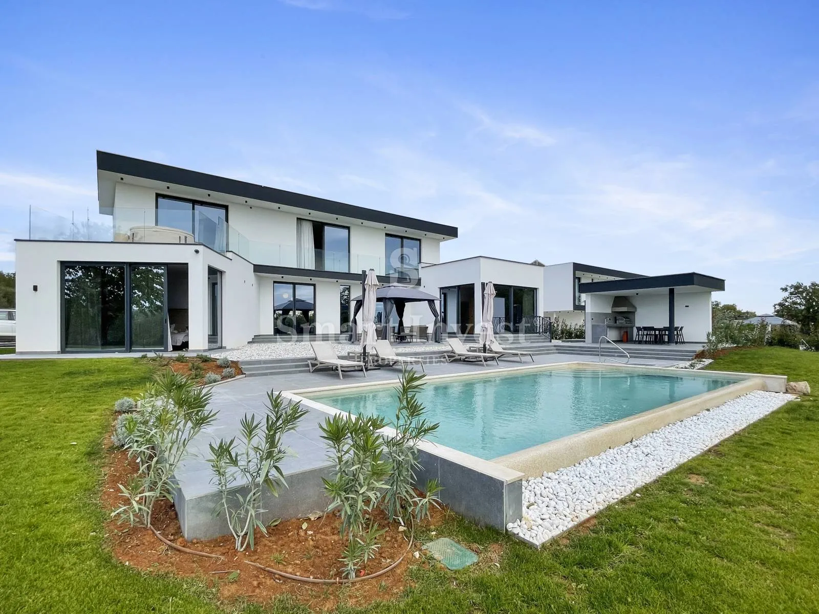 POREČ - KAŠTELIR Na prodaju je moderna luksuzna vila s grijanim bazenom, spa zonom i lijepim pogledom na more, na prekrasnoj lokaciji okruženoj maslinicima te svega desetak minuta vožnje udaljenoj od mora i Poreča. Vila površine 403 m2 smještena je na zemljištu površine 1.450 m2, ima 4 spavaće sobe, 4 kupaonice + 2 WC-a. U prizemlju se nalazi open space dnevni boravak sa kuhinjom i blagovaonicom, jedna spavaća soba s vlastitom kupaonicom (iz koje se također izlazi u vrt), dok su u suterenu smješteni gym i spa zona sa saunom i jacuzziiem. Na prvom katu su smještene tri spavaće sobe sa vlastitim kupaonicama, svaka soba ima izlaz na lijepu terasu, na kojoj se nalazi jacuzzi. S gornje terase pruža se panoramski pogled na zapadnu obalu Istre od Novigrada prema Vrsaru. Vilu krasi veliki lijepo uređeni mediteranski vrt u kojem su se smjestili grijani bazen (50 m2) sa sunčalištem i natkrivena vrtna kućica sa roštiljem, te više parkirnih mjesta. Vrt je noću osvjetljen pa stvara ugodan ambijent. Vila je opremljena materijalima visoke kvalitete, modernog je eksterijera i interijera (tamnijih tonova). Opremljena je podnim grijanjem, klima uređajima za hlađenje, a ima i solarne panele te grijani bazen sa zimskim pokrivačem. Okružena je maslinicima (poljoprivredna zona) koji stvaraju ugođaj mira i opuštenog življenja. Vila je udaljena svega par minuta vožnje od centra Kaštelira, poznatog po proizvodnji i prodaji domaćih poljoprivrednih proizvoda, maslinova ulja i vina. U blizini su lokalni restorani visoke kvalitete, vinarije, dućani, a do Poreča i mora se stiže za svega 10-ak minuta vožnje. Ova moderna vila kategorizirana je za turistički najam i vrlo uspješno se iznajmljuje. Za više informacija i razgled nazovite +385/99/320-0008 ID KOD AGENCIJE: 13712 Agencija Opatija Ovlašteni posrednik Mob: +385/99/320-0008 E-mail: office@smart-invest.hr www.smart-invest.hr
