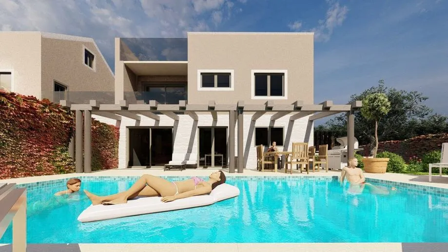Svaka kuća ima cca 180 m2 , a sastoje se od 3 spavaće sobe, 2 kupatila, wc, kuhinje sa blagovaonom i dnevnog boravka, spremišta, ostave, terase , dvorišta sa bazenom i 2 parkinga.