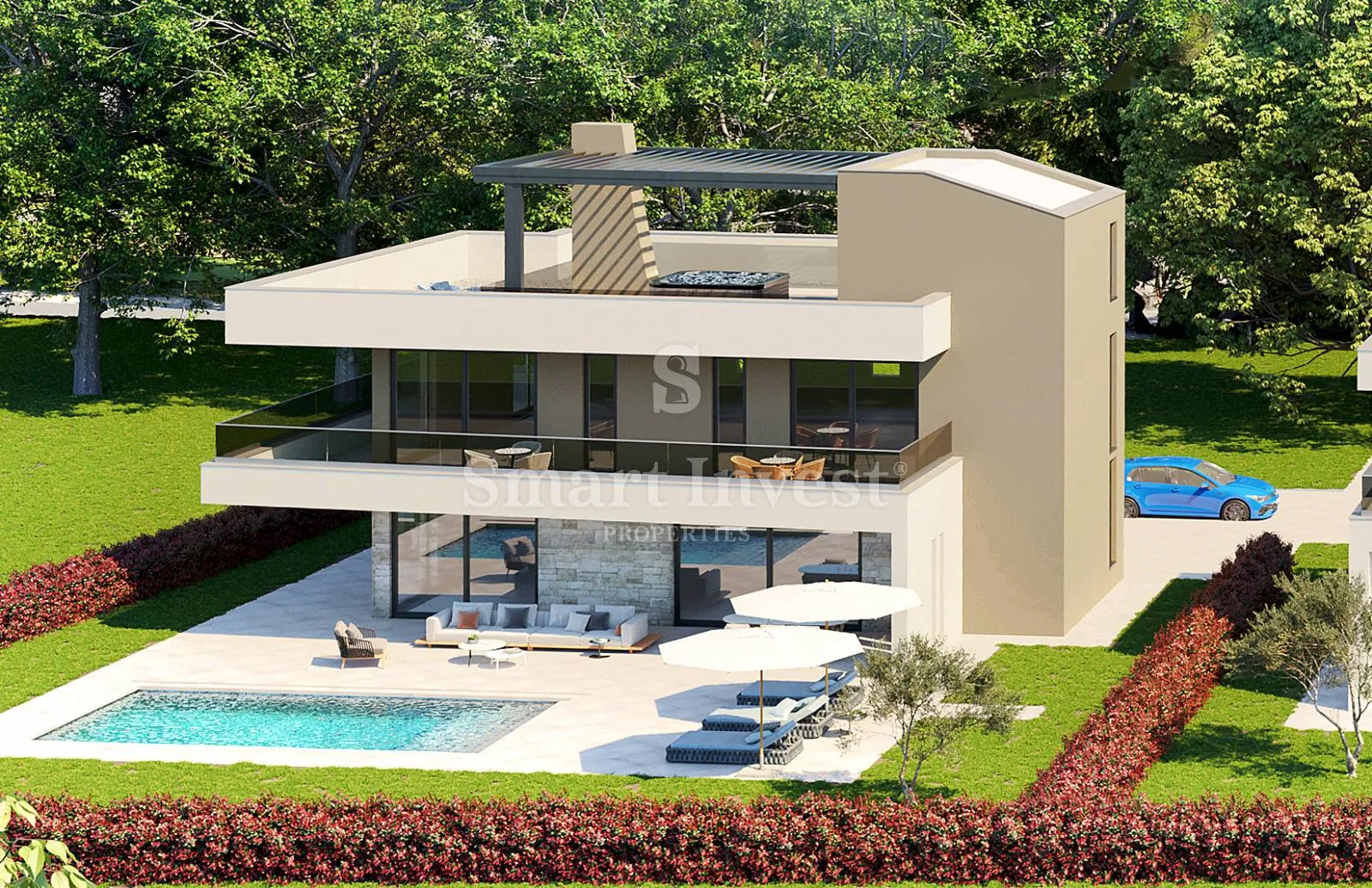 ISTRA - POREČ, Na prodaju je luksuzna vila s bazenom, wellnesom, raskošnom krovnom terasom te prekrasnim pogledom na more na odličnoj lokaciji svega 5 minuta vožnje udaljenoj od mora i plaža. Predviđeni rok završetka radova u 05/2023. RASPORED I OPREMA Vila V1 neto stambene površine 306.03 m2 smještena je na uređenom zemljištu površine 772 m2, ima 4 spavaće sobe, 4 kupaonice + 1 WC. U prizemlju se nalazi natkriveni trijem, ulazni hodnik, prostrani dnevni boravak s kuhinjom i blagovaonicom te s izlazom na natkrivenu terasu, wellness sa saunom i tušem, wc, praonica, prostor grijanja/spremište. Na prvom katu se nalazi hodnik i 4 prostrane spavaće sobe svaka s vlastitom kupaonicom. Tri spavaće sobe imaju izlaz na prostranu terasu s koje s pruža predivan pogled na more. Na drugom katu se nalazi raskošna krovna terasa s panoramskim pogledom na more. Ovdje je predviđen prostror za relaksaciju te vanjska kuhinja s dodatnim spremištem. • podno grijanje i priprema PTV na dizalicu topline Mitsubishi + VRF inverter sustav sa 6 unutarnjih klima jedinica • kamin u dnevnom boravku • termoizolacija fasade, ETICS sustav • podne podloge – keramika I klase u prizemlju, visokokvalitetni parket u sobama i keramika I klase u kupaonicama na prvom katu • ALU vanjska stolarija antracit boje, s prekinutim toplinskim mostovima i termoizolacionim staklom • alarm i videonadzor Na lijepo uređenoj okućnici smješten je bazen od 32 m2 dubine 1.35 m, hortikulturno uređene zelene površine te 2 parkirna mjesta. LOKACIJA Vila je smještena na lijepoj mirnoj lokaciji u okruženju vila i kuća za odmor, s prekrasnim pogledom na more. U blizini je nekoliko odličnih restorana, vinarije, supermarket i ostali potrebni sadržaji, udaljenost od mora i najbližih plaža – 2,7 km, od centra Poreča – 8 km. Zahvaljujući lokaciji ova prekrasna vila je pogodna i za obiteljski život i za investiciju u turističke svrhe. CIJENA Navedena cijena se odnosi na kompletno završenu vilu po principu ključ u ruke, bez namještaja. U cijenu je uključen PDV 25%, kupac je oslobođen plaćanja poreza na promet nekretnina. U slučaju kupnje na firmu registriranu u Hrvatskoj moguć je povrat kompletnog PDV-a nakon kupoprodaje. Za više informacija i razgled nazovite +385/91/320-0021 ID KOD AGENCIJE: 13233 Agencija Opatija Ovlašteni posrednik Mob: +385/99/320-0008 E-mail: office@smart-invest.hr www.smart-invest.hr
