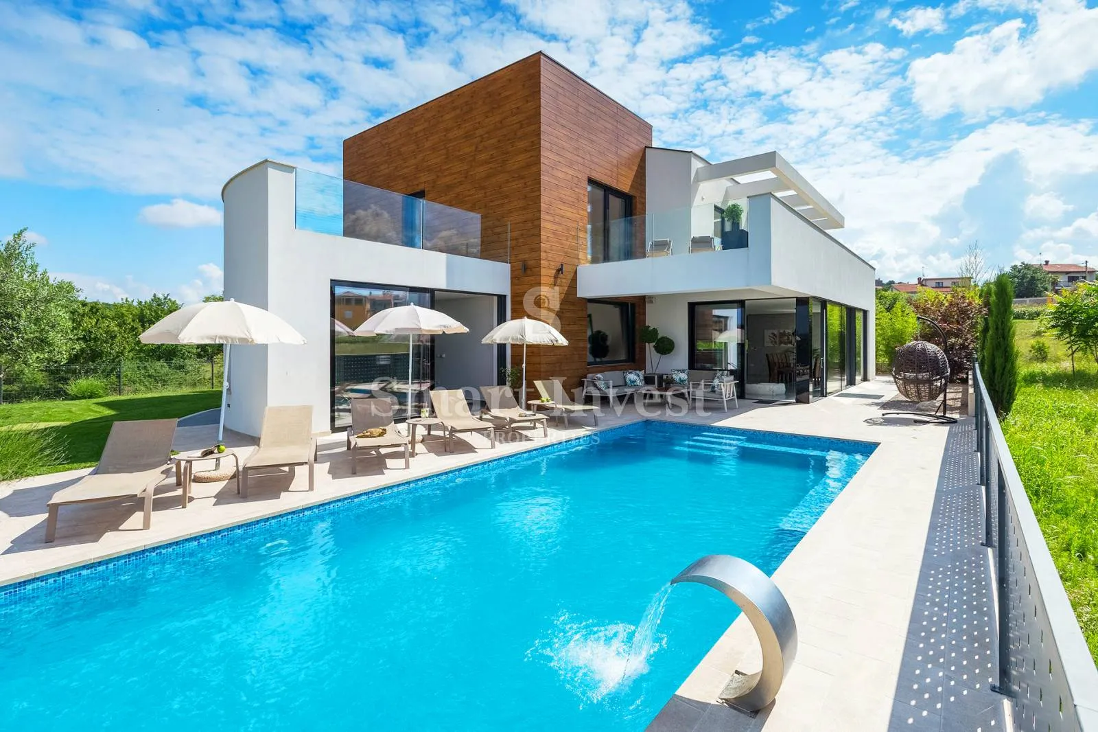 POREČ, okolica. Moderna vila s bazenom i pogledom na more na prekrasnoj mirnoj lokaciji u okolici Poreča, 10 km do mora. Ova vila moderne arhitekture i dizajnerskog interijera sastoji se od podruma, prizemlja i kata, ukupne površine 370 m2 na parceli površine 791 m2, ima 5 spavaćih soba i 4 kupaonice. RASPORED I OPREMA U prizemlju se nalazi prostrani dnevni boravak sa blagovaonicom i kuhinjom, prostor za opuštanje sa direktnim izlazom na terasu za sunčanje i prema bazenu, jedna spavaća soba, kupaonica, gostinjski wc. Iz dnevnog boravka sa velikim staklenim stijenama koje pružaju osjećaj komfora i prozračnosti ambijenta izlazi se na lijepo uređeno sunčalište i prema bazenu površine 38 m2. Sa druge strane nalazi se vanjski kamin sa blagovaonskim stolom za druženja u ugodnom i intimnom dijelu okućnice. Na prvom katu nalaze se tri spavaće sobe sa izlazom na veliki zajednički balkon sa kojeg se pruža prekrasan pogled na okolni krajolik i na more, dvije spavaće sobe imaju integrirani prostor za garderobu, a jedna ima vlastitu kupaonicu. Također tu je i još jedna velika kupaonica. U rustikalno uređenom podrumu se nalazi kuhinja sa kaminom i velikim blagovaonskim stolom, biljarski stol, kupaonica i spavaća soba. Vila se prodaje kompletno namještena i opremljena. Podno grijanje, klima, alarm, videonadzor, roletne na struju, navodnjavanje okućnice. Lijepo uređena okućnica u potpunosti je ograđena i garantira privatnost. Sama lokacija pruža mir i tišinu. Vila ima dobro uhodan posao turističke rente i idealna je kao investicija ali i kao kuća za luksuzan obiteljski život. LOKACIJA Vila se nalazi na prekrasnoj mirnoj lokaciji okruženoj prirodom, uz to svakodnevna infrastruktura (restoran, trgovina, banka, ljekarna itd) udaljena cca 10-15 minuta šetnje, udaljenost od mora i prekrasnih plaža u Poreču - 10 km. Za više informacija i razgled nazovite +385/99/320-0008 ID KOD AGENCIJE: 12999 Agencija Opatija Ovlašteni posrednik Mob: +385/99/320-0008 E-mail: office@smart-invest.hr www.smart-invest.hr