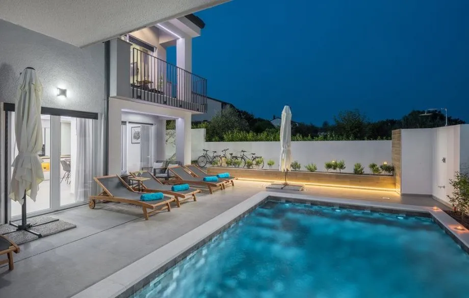 Kuća ima 160 m² s okućnicom od 250 m² koja osigurava privatnost i prostor za opuštanje. Uz kuću je smješten bazen od 24 m2, idealan za osvježenje tijekom toplih dana.
